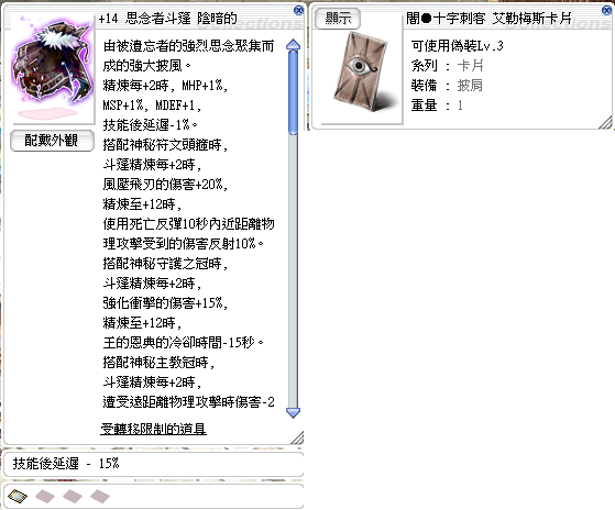 +14思念者斗篷(技能後延遲15%、刺王卡)