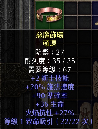 (非天梯)黃術士頭 +2術士技能+20%施法+90準 +27火炕