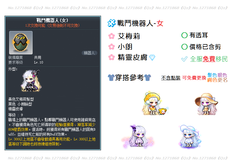 道具 【戰鬥機器人(女)】 《已整好透耳戰女》《全服免費移民》《艾梅莉+小朗》🍁【Qz】