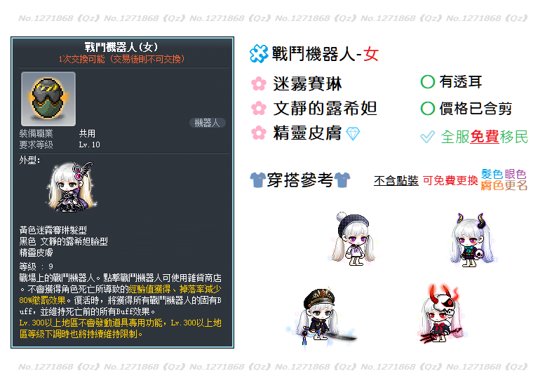 道具 【戰鬥機器人(女)】 《已整好透耳戰女》《全服免費移民》《迷霧賽琳+文靜的露希妲》🍁【Qz】