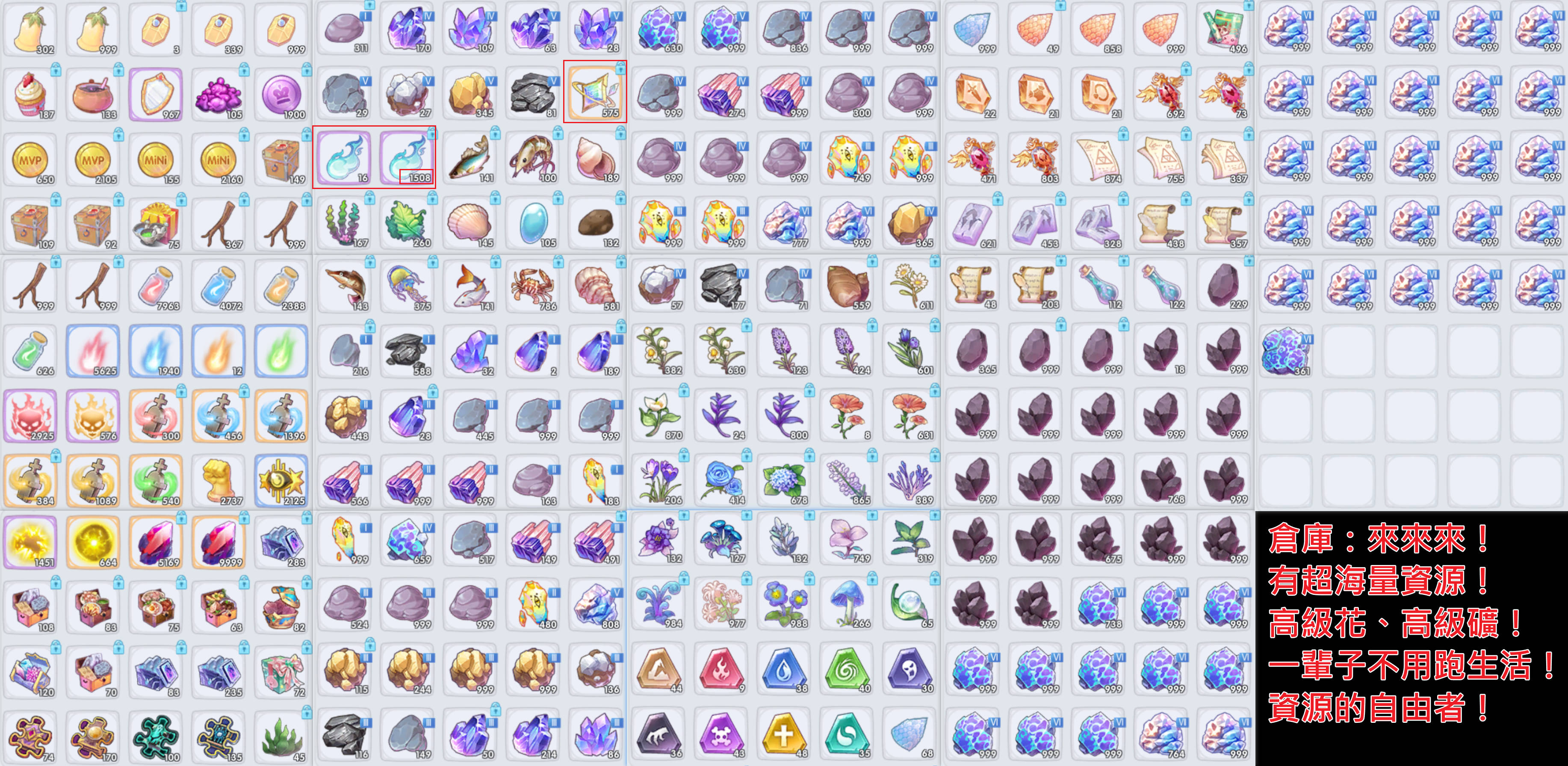 💝內有『千萬水晶』上方會即時更新資源,讓您可以少課金、自由發揮!倉庫還有大量資源、礦產、漁獲、花草。