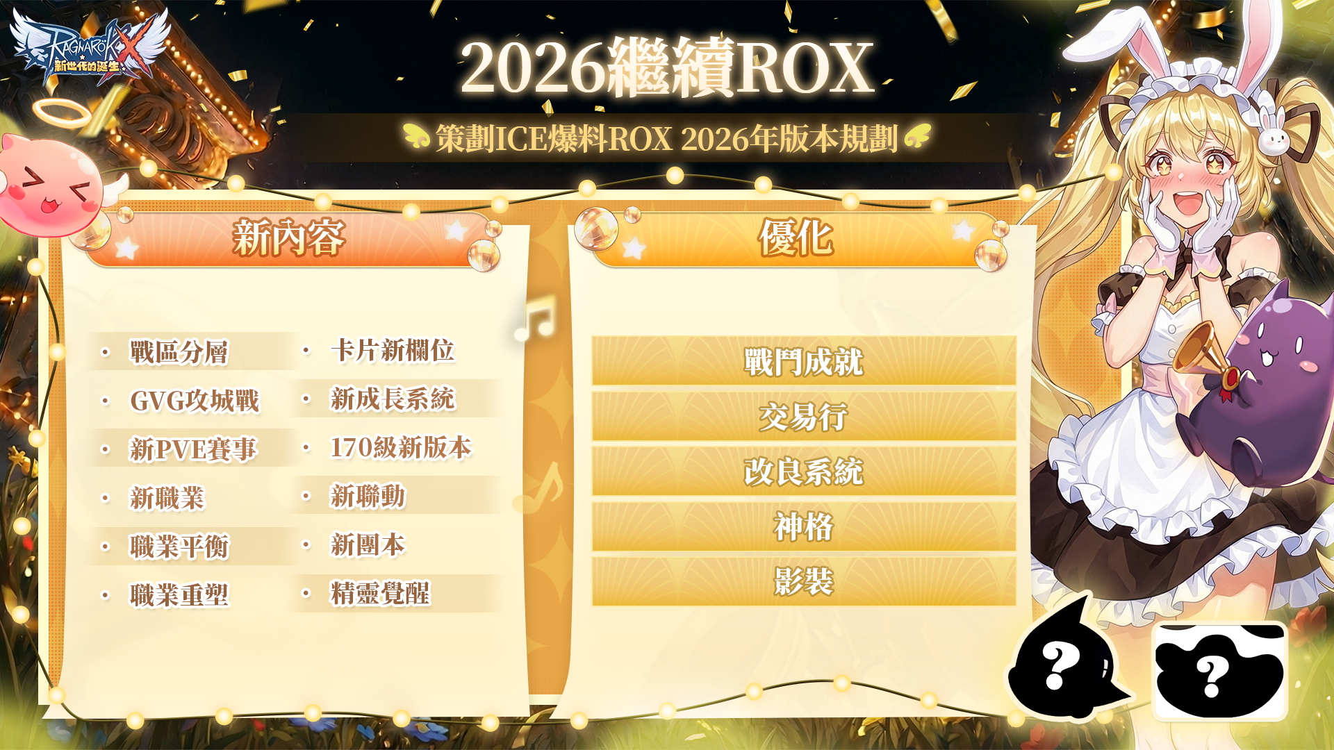 💝ROX目前還是有很多伺服器、玩家還是很多,之後進度差不多服的都會「合併」不怕沒人玩,只怕沒有「好帳號」體驗遊戲啦!這遊戲是國際開發「優質的美術與流暢性、超萌的時裝動作、超流暢自由又完善的自動戰鬥系統、無限時間爽爽掛機!」是實力派的代表,國際服開發團隊,仍會不斷更新精彩內容,只要有個「好帳號」就可以悠遊自在、為所欲為的暢玩啦!