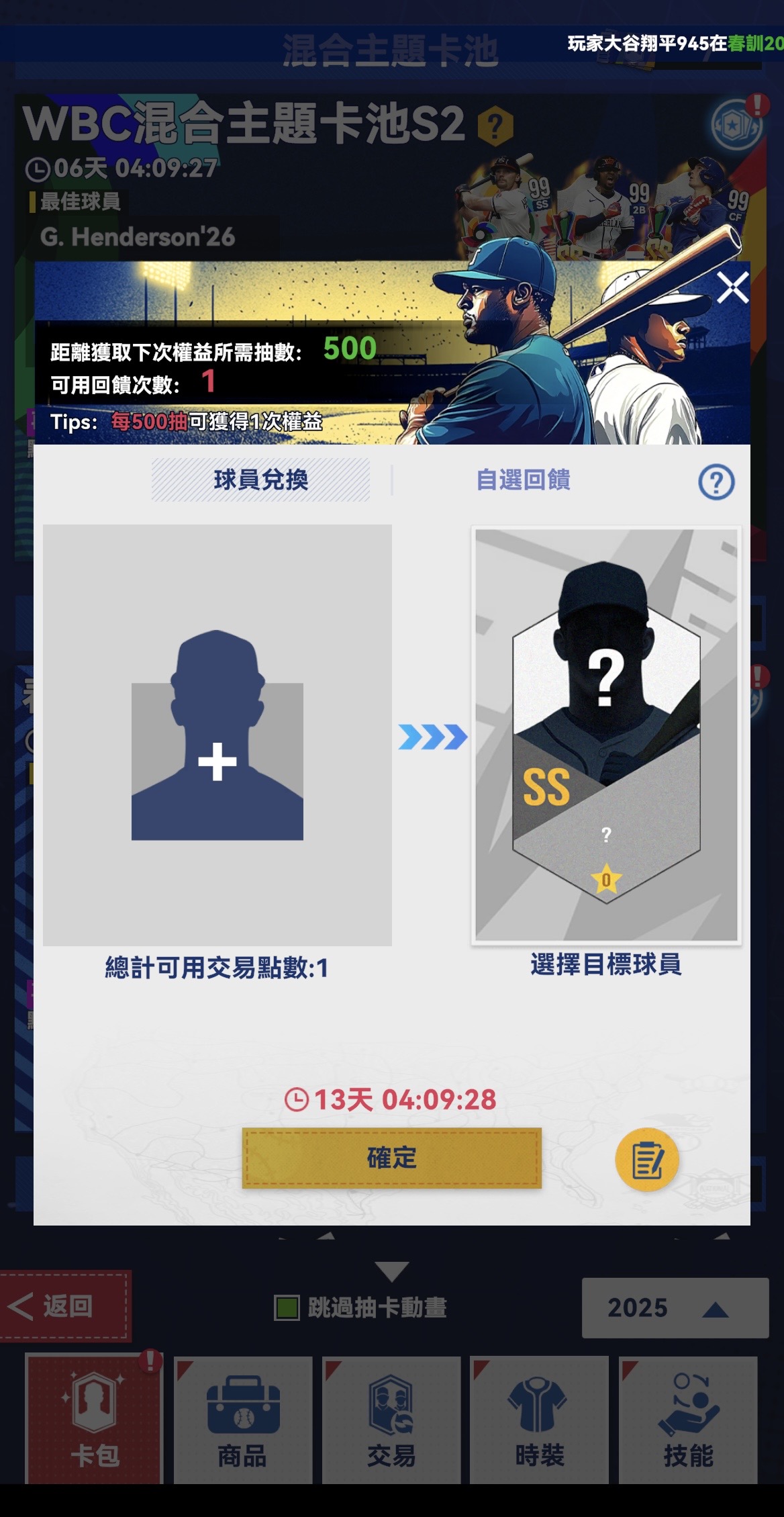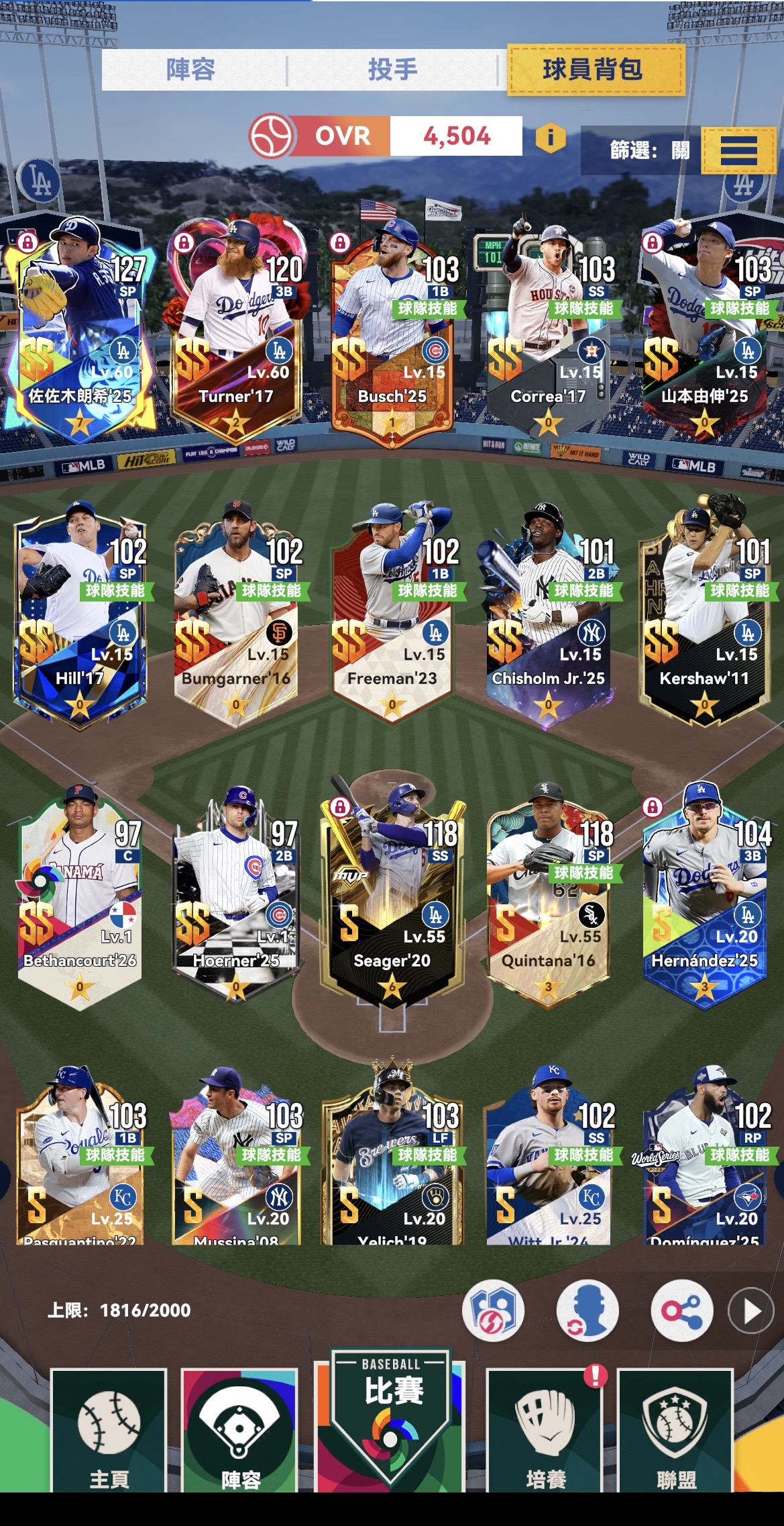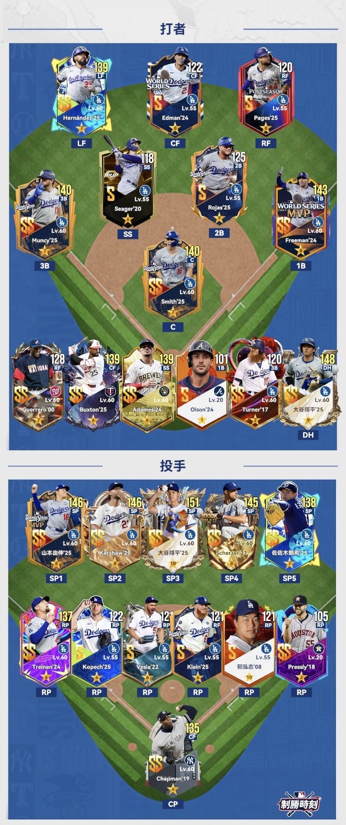 來時路,原先剛開始玩一直想收有道奇隊的帳號,但永遠就是缺哪隻缺哪隻有的沒的!後面自己抽好抽滿!有些角色不是你當下有錢就能馬上得到(要配合檔期活動)目前遊戲內能得到的道奇球員強的幾乎都有了!差ss木屐(本來要用權益次數換出來結果卡池給我更新....目前能得到的辦法就是隨機抽到或者有2024季後賽那個包可以拼4/1機率!再來就是ss泰瑞在榮耀通行證可以換)