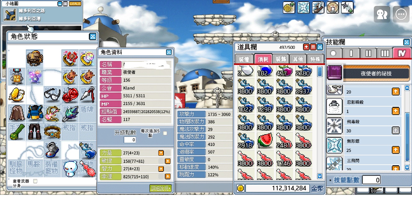 帳號 【156等、暗殺者_夜使者】 楓表3060 / / 楓幣1億 內容豐富不清 內容估計清個5E