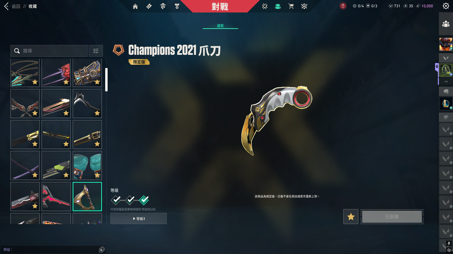 刀:21-25冠 憐憫之刃 奧術拳套 太極扇(紙扇) 玉龍半月 奇點蝴蝶刀 紙板自製戰斧 掠奪小刀 渾沌戰錘 猛攻之境小刀 異星霸主鎖鏈刀 惡鬼利爪 獄焰雙刃(流膿)  緋金聖龍小刀 靈爭鬪魂鐮刀 EXO打刀 RGX直刀 SplashX拳套