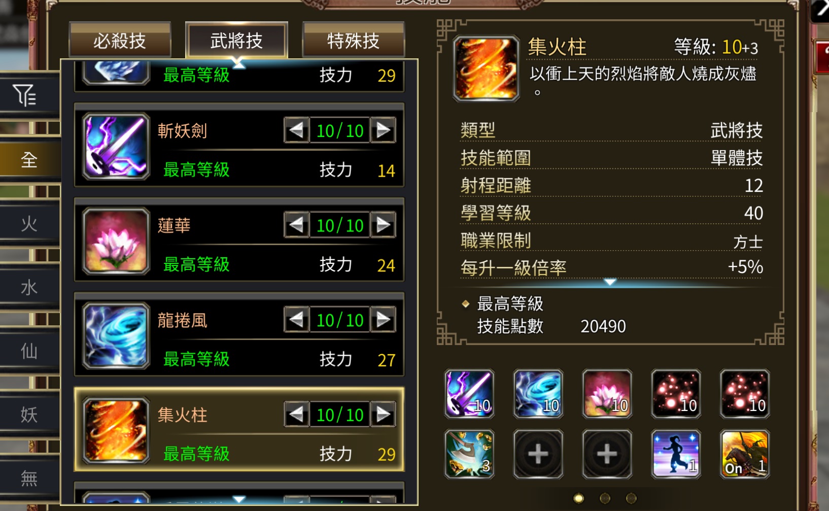 技能如圖:本命技能 高價的集火柱 八面火都已經學了!