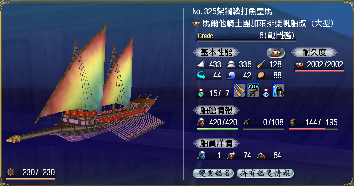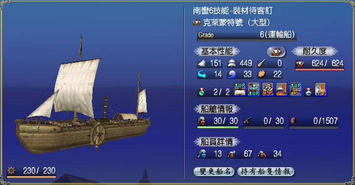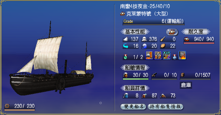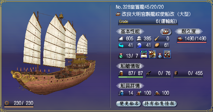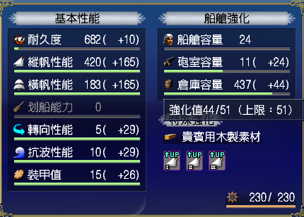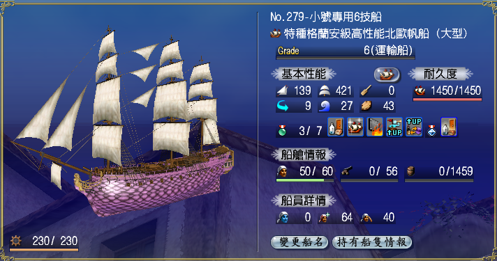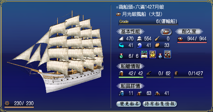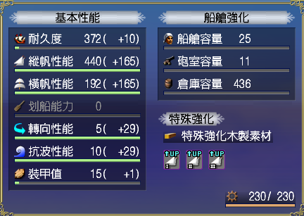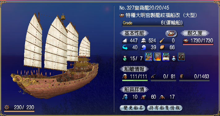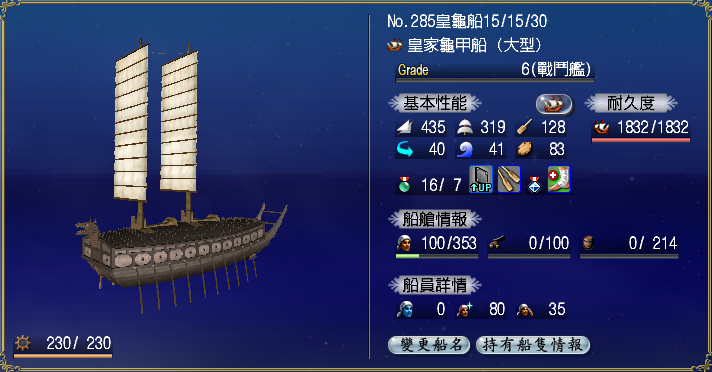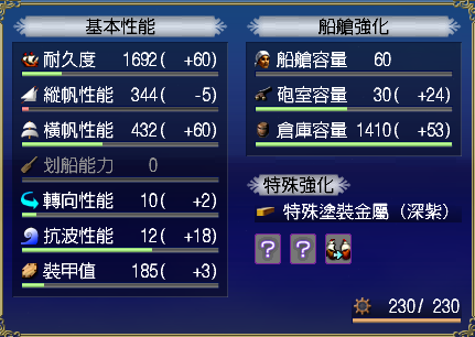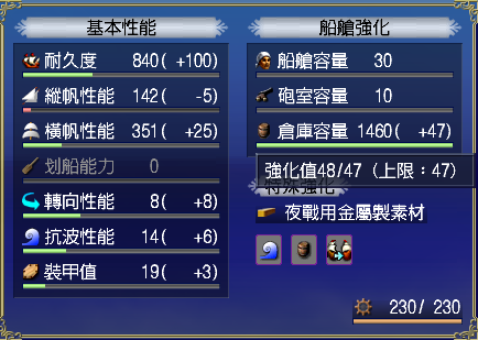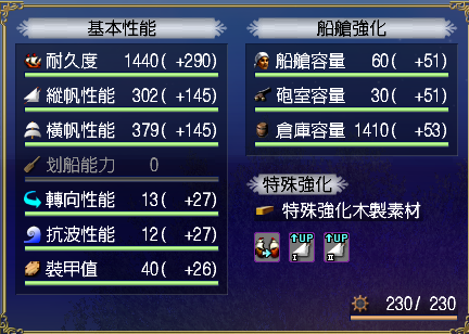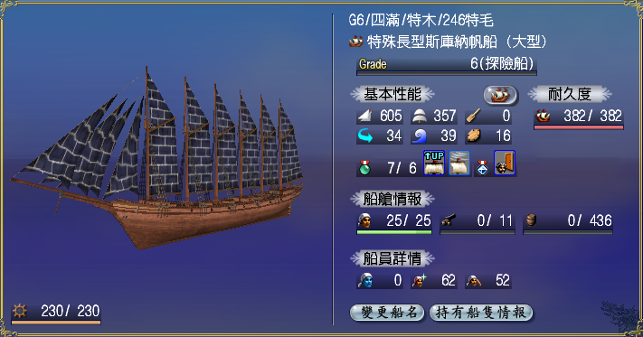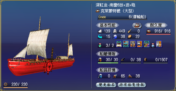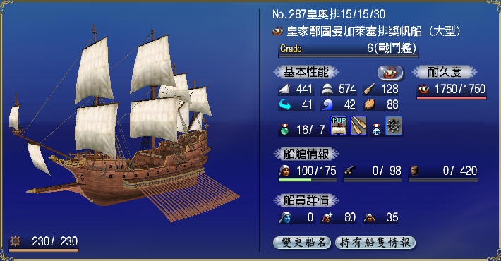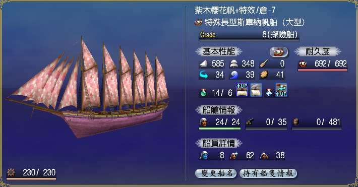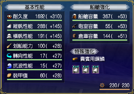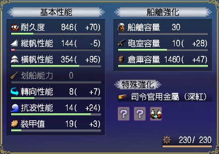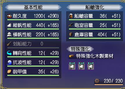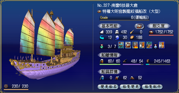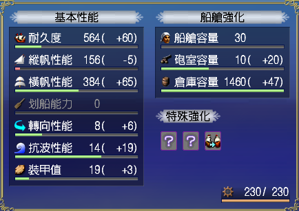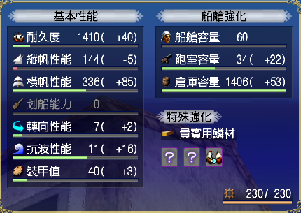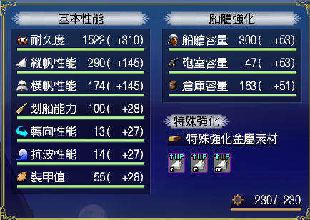 【強化性能】双帆、抗波、轉向、裝甲滿,倉庫差7滿(需要可補滿)