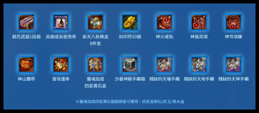 帳號 ◆自選伺服器◆高速成長券◆弒花武器◆泰王氣魄◆泰天八卦4星寶石盒沙暴手鐲箱