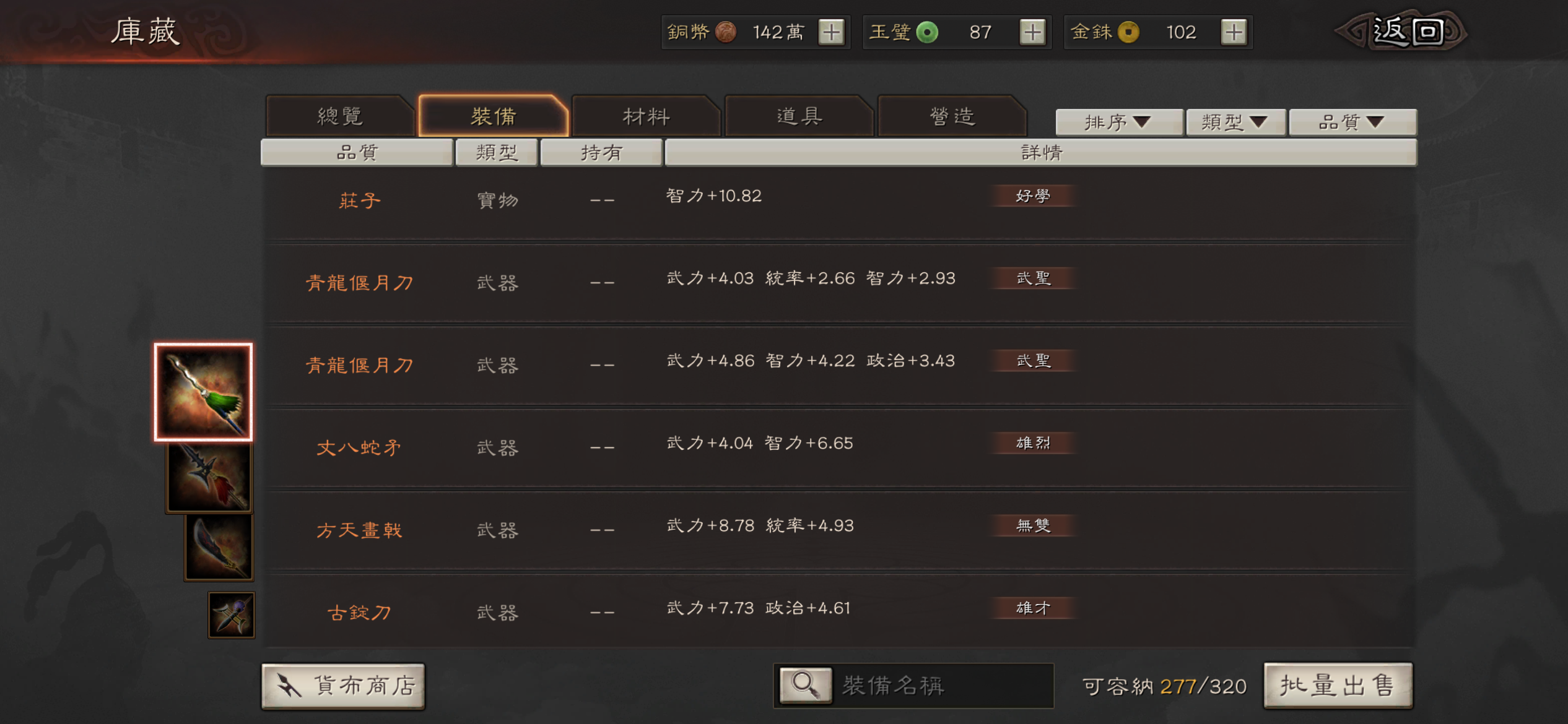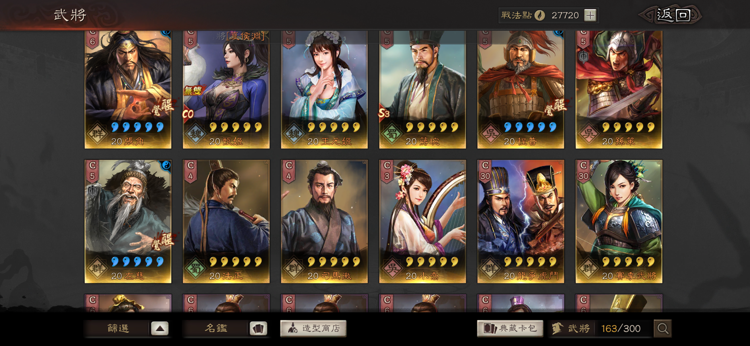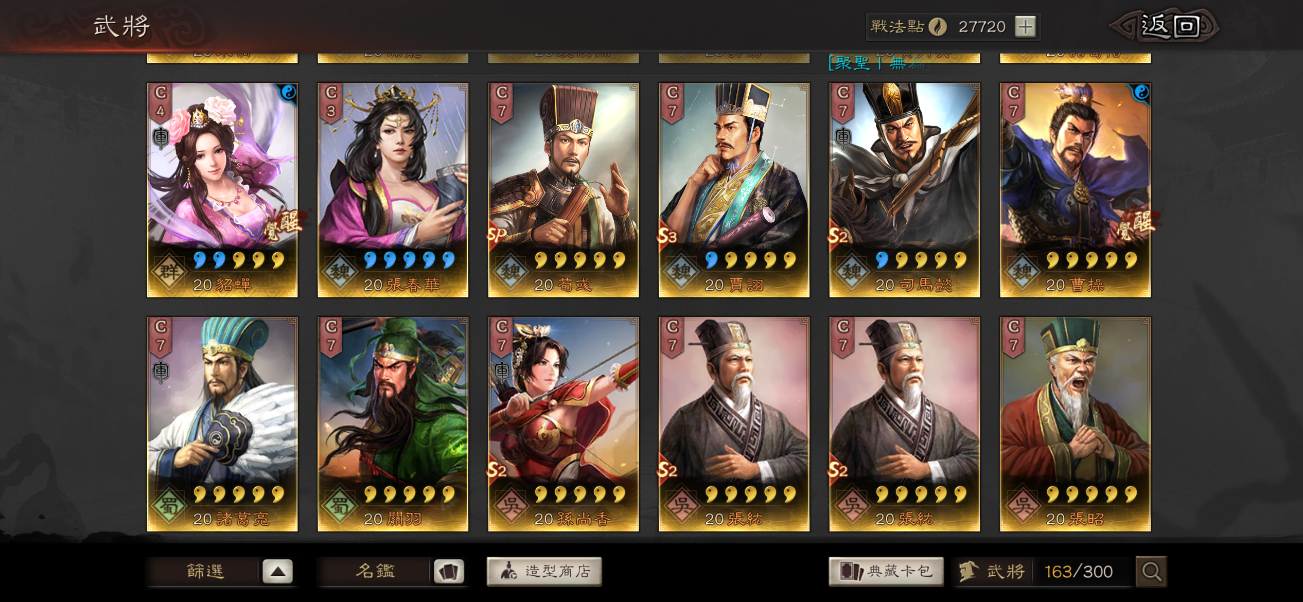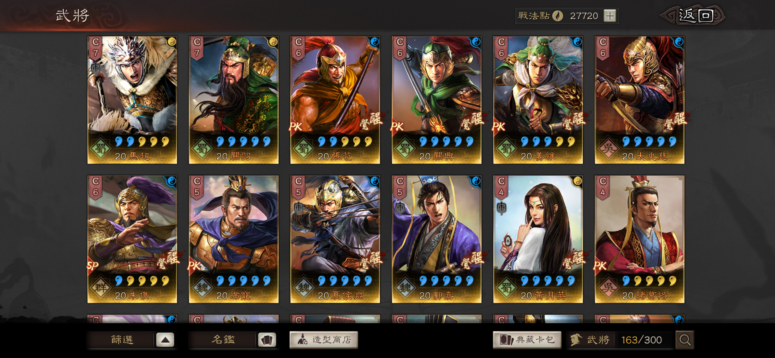 裝備:蠻力*2、石膏*3、幽影*3、符咒*2、平衡*1、妖氣*3、凝神*2、祝福*1、剛毅*2、忍讓*3、沈重*1、迅疾*1、踩踏*1、學識*1、幸運*2、好學*1、武聖*2、熊烈*1、無雙*1、雄才*1、靈動*1、援助*2、昭烈*1、嘶風*2、倔強*1、天公*1、虎峙*1、赳螑*1、號令*1