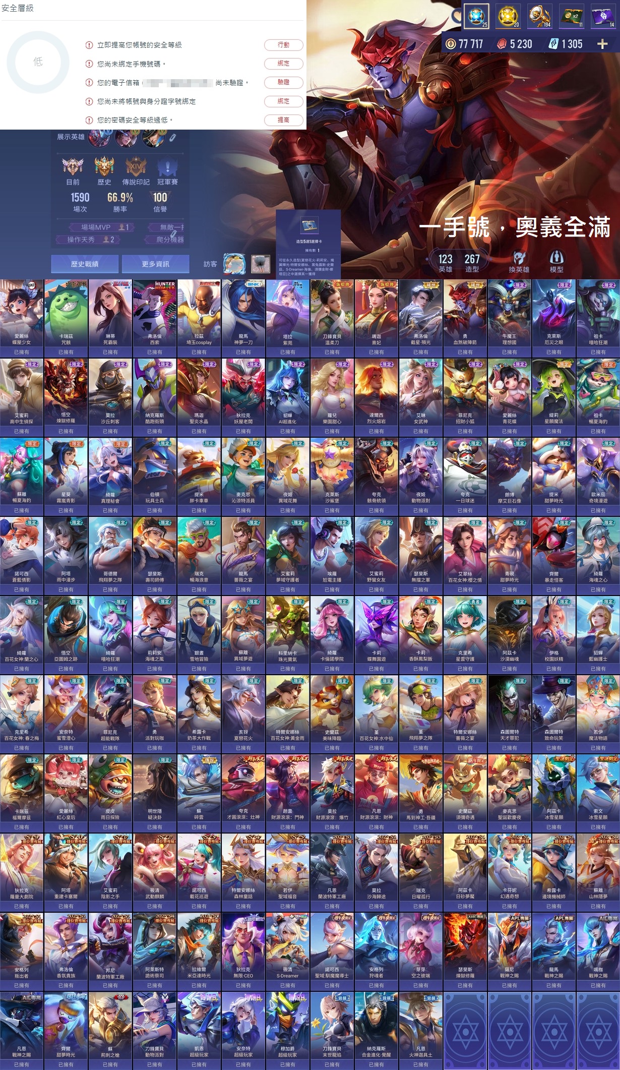 帳號 【Garena帳無綁無連、戰場傳說、V2、123英、271造】 歷史光影,奧義全滿,一手自用、身分證未綁、超乾淨體質,歡迎詢問