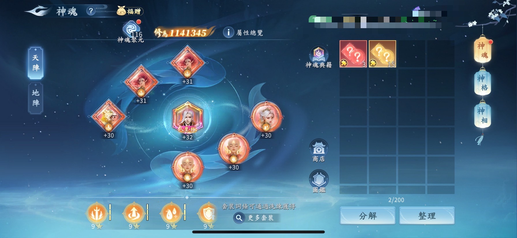 【999等】 一個不用花大錢角色基底好,神魂四套9星千萬號,不急售 可議