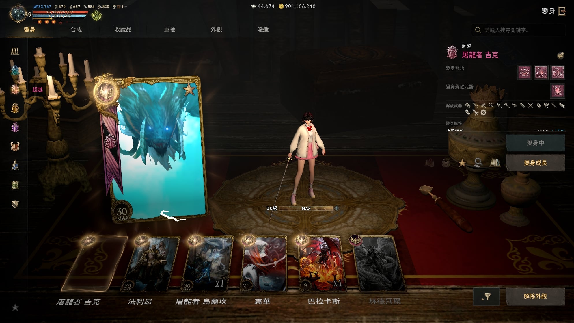 天堂W : 89.46%、15粉、20金、最高攻命552/800 防850、減傷388、抗暈237%、1金滿紫技、火/水眼滿分、8刻印紫裝、收藏57.74%、3紫加護、+6巨神符石、深淵杜賓狗、鬼劍 EP.904