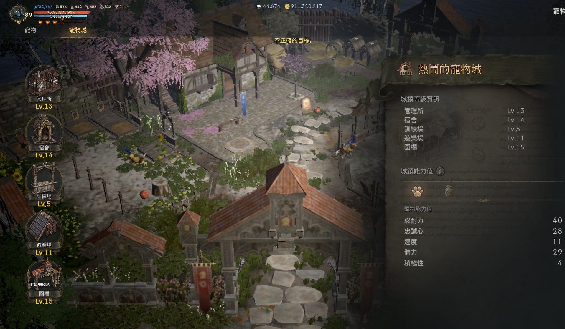 【寵物城】:管理所Lv13、宿舍Lv14、訓練場Lv5、遊樂場Lv11、圍欄Lv15