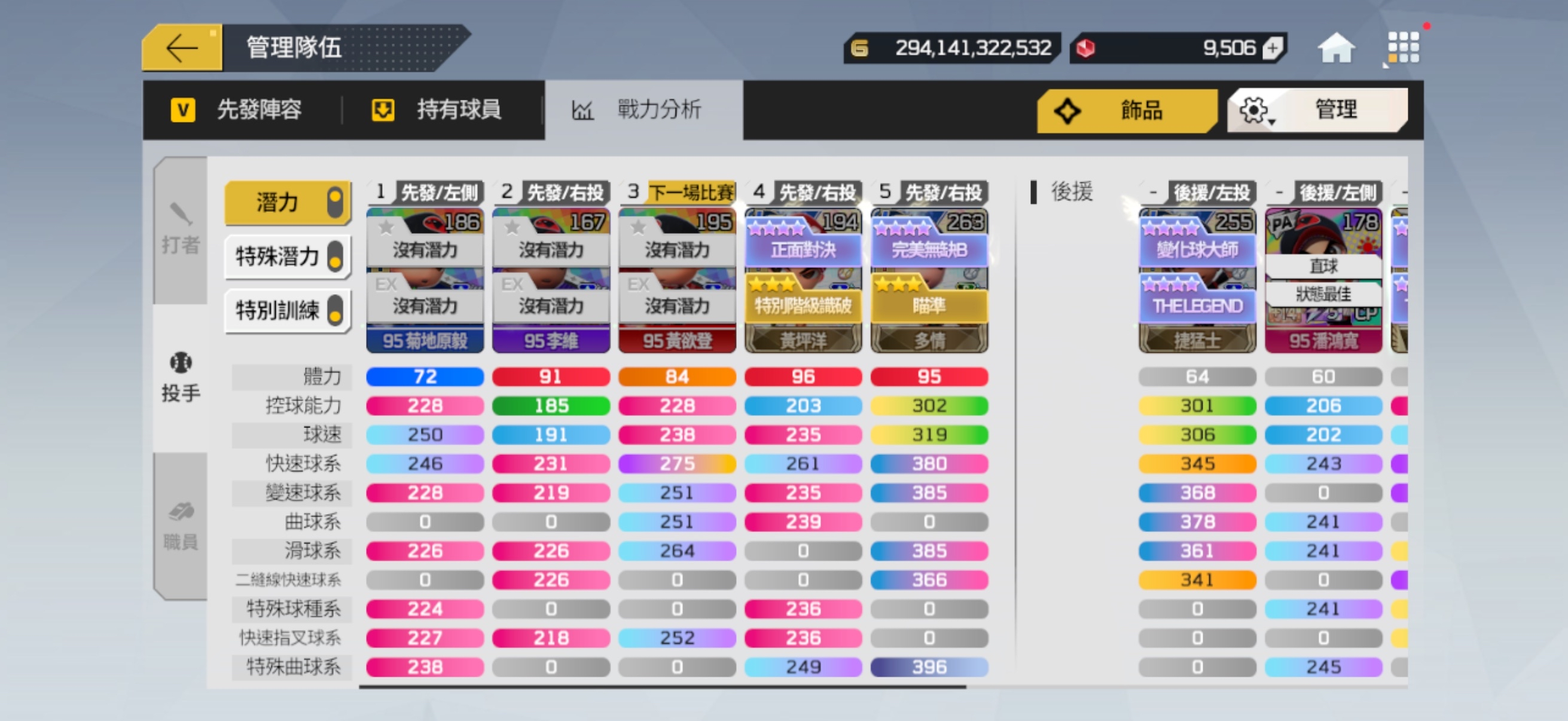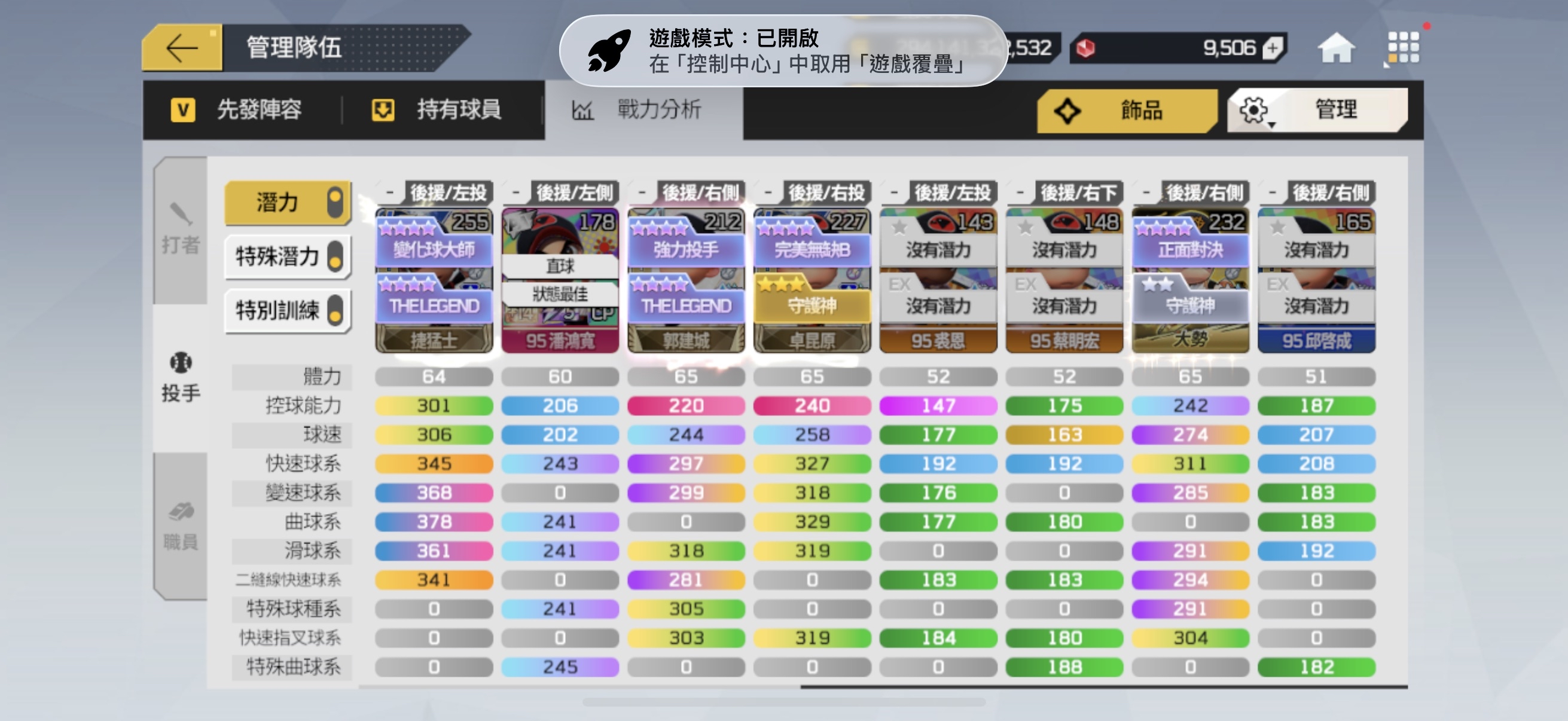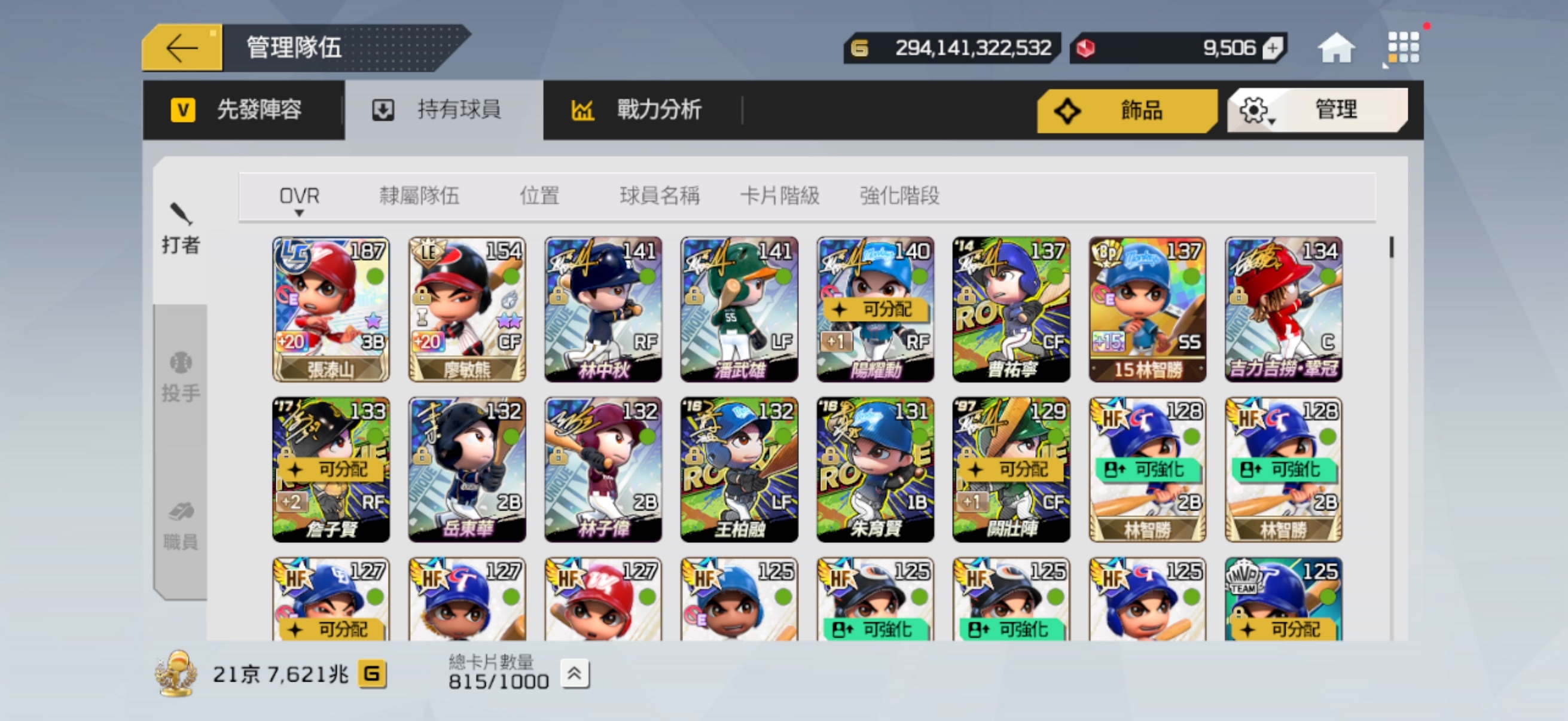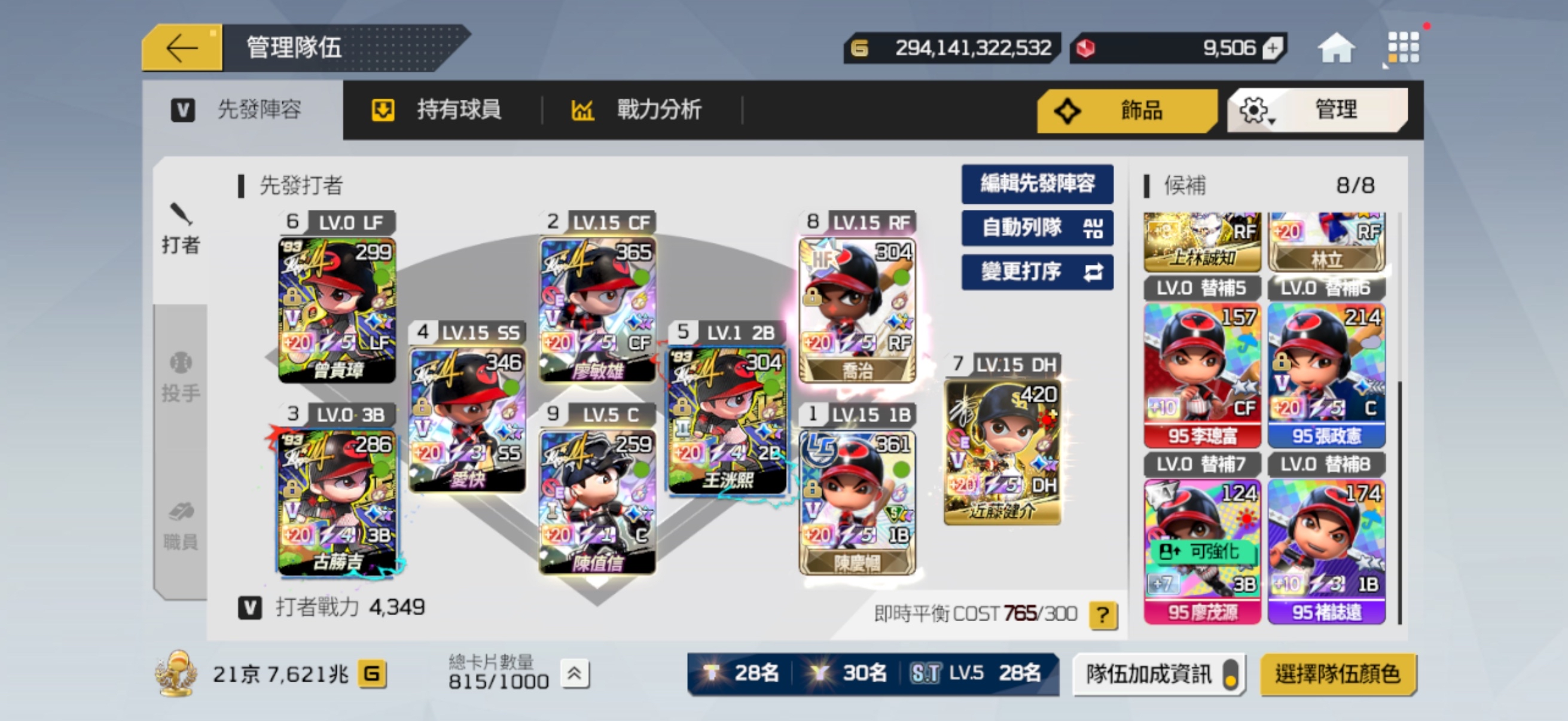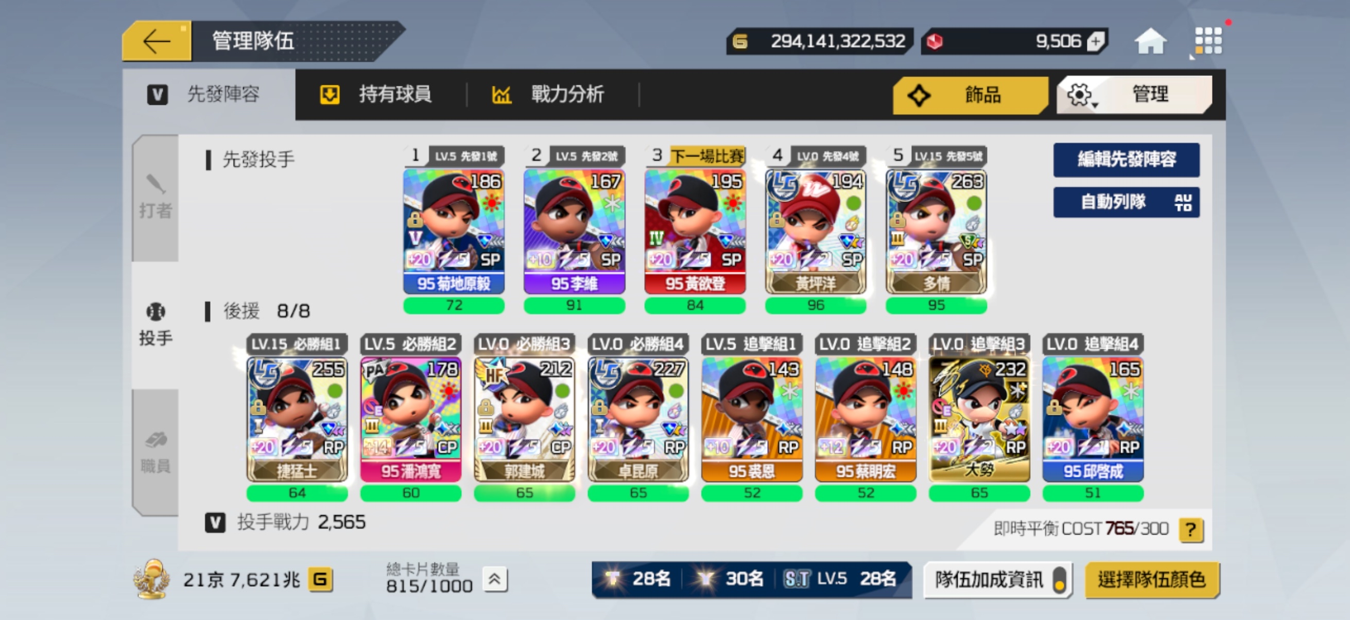 先發陣容也有配一組可打平衡的隊伍 (球員箱有1張LE+20廖敏雄)