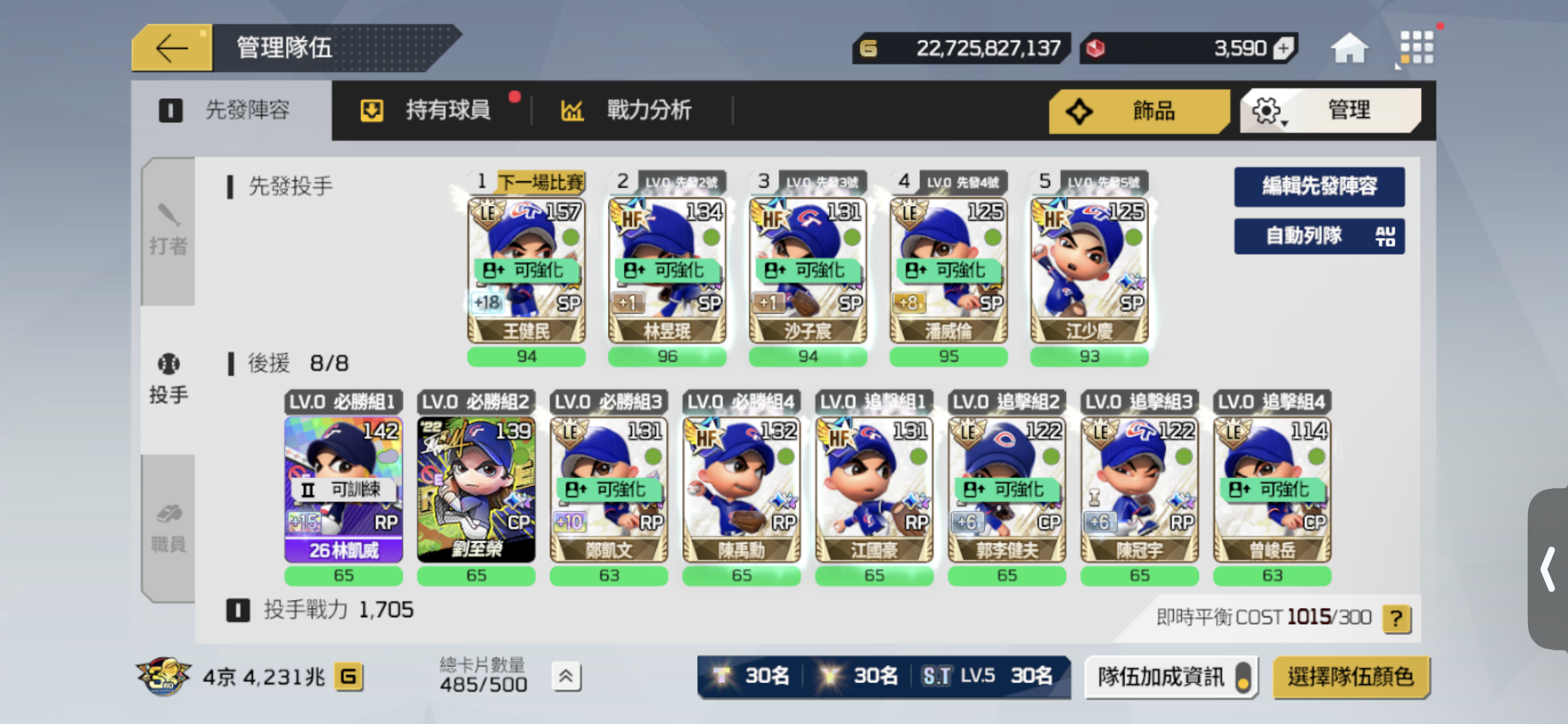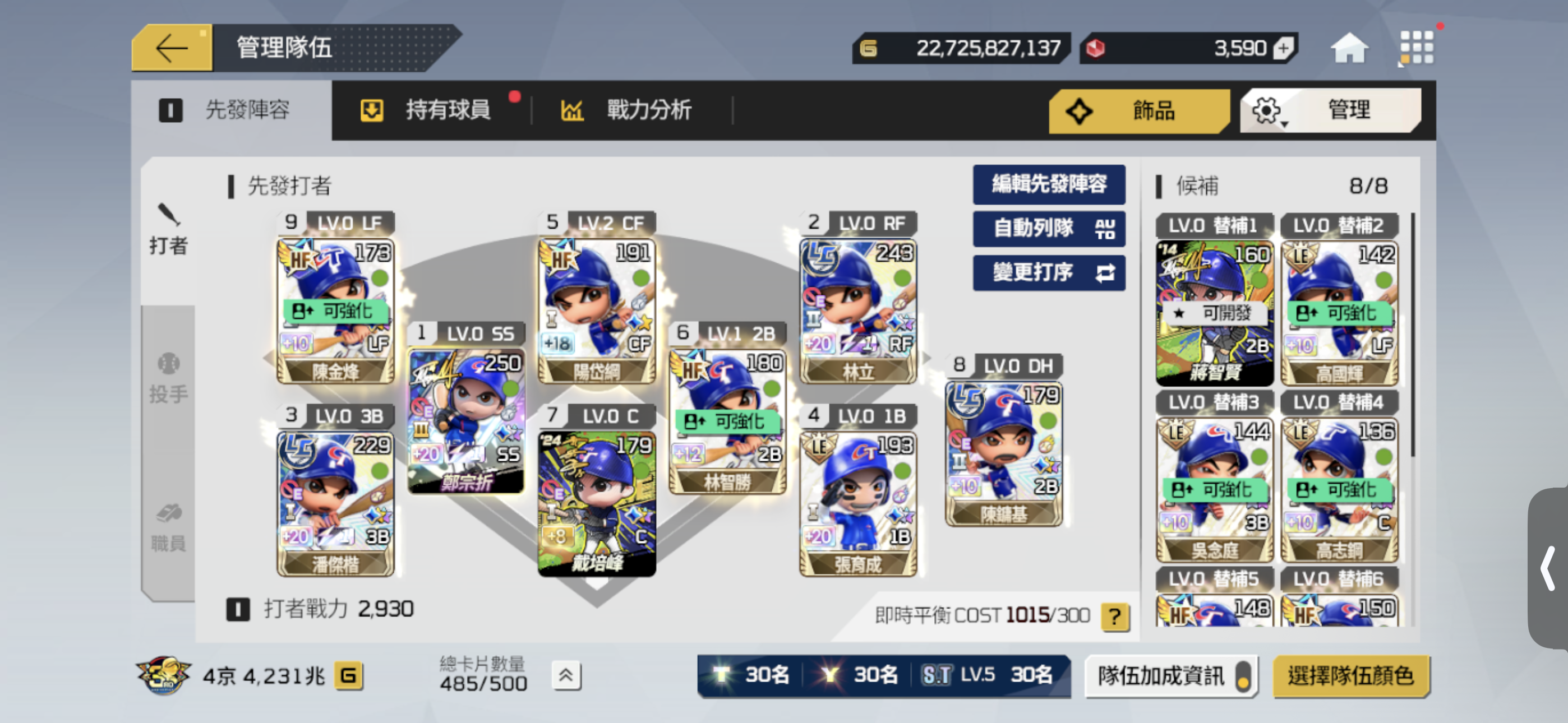 【65等】 4.5京 26年中華隊 皆為頂級卡階 大師裝備 抽獎券多 打者強化高加成