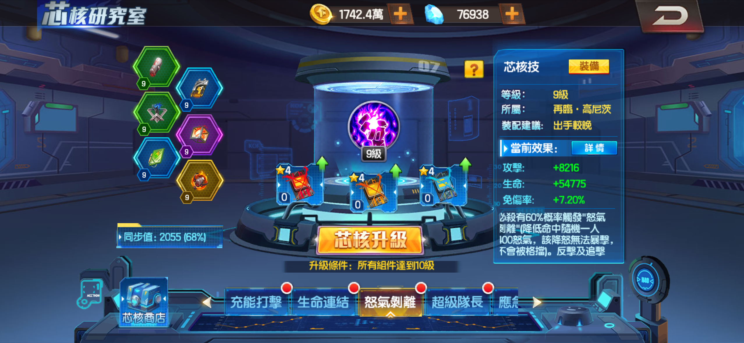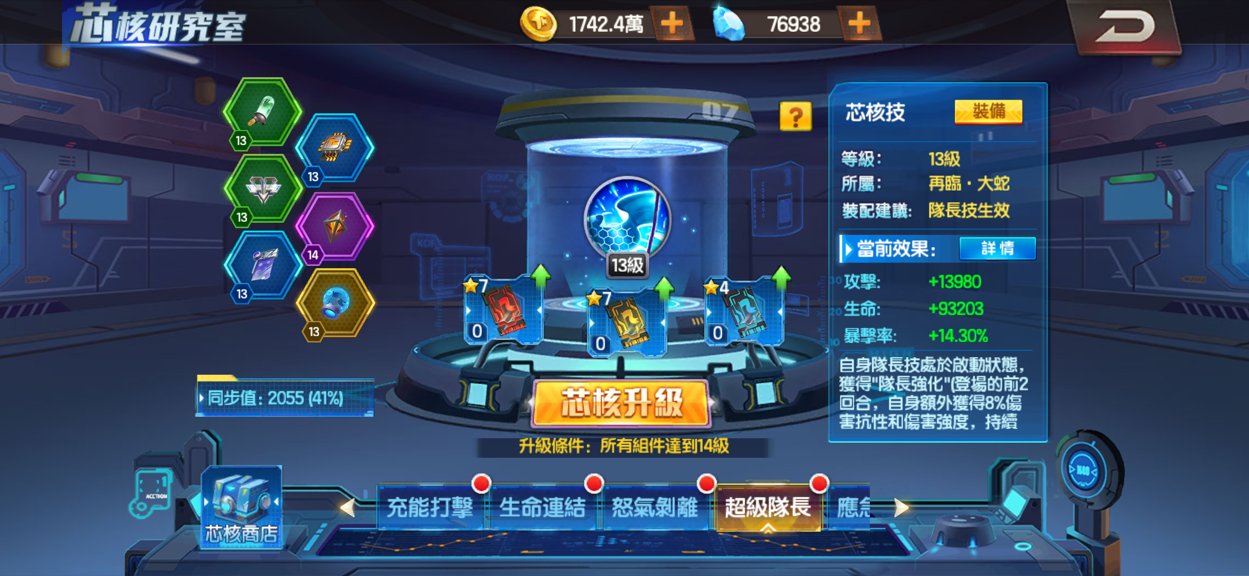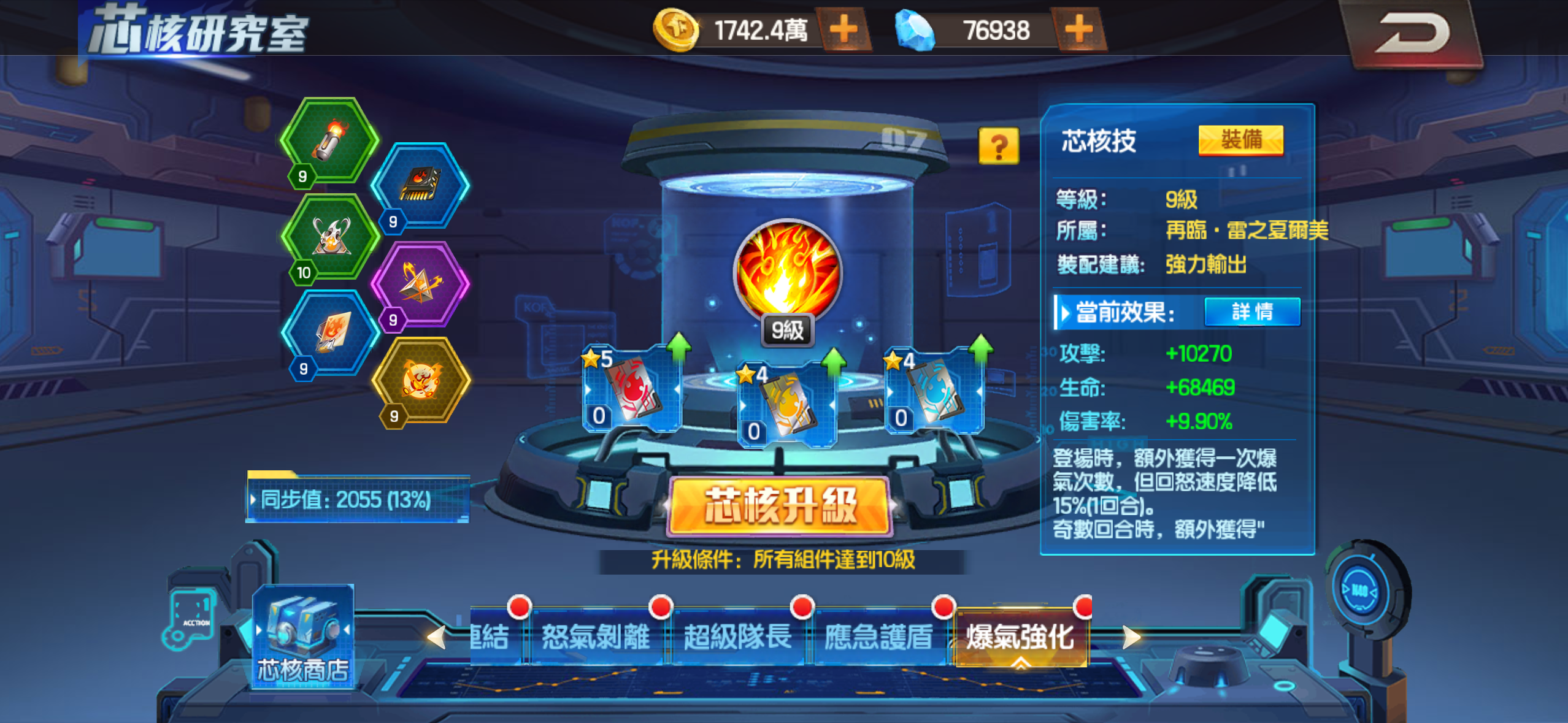 芯核 超級隊長13級 爆氣強化 怒氣剝離9級 充能打擊6級