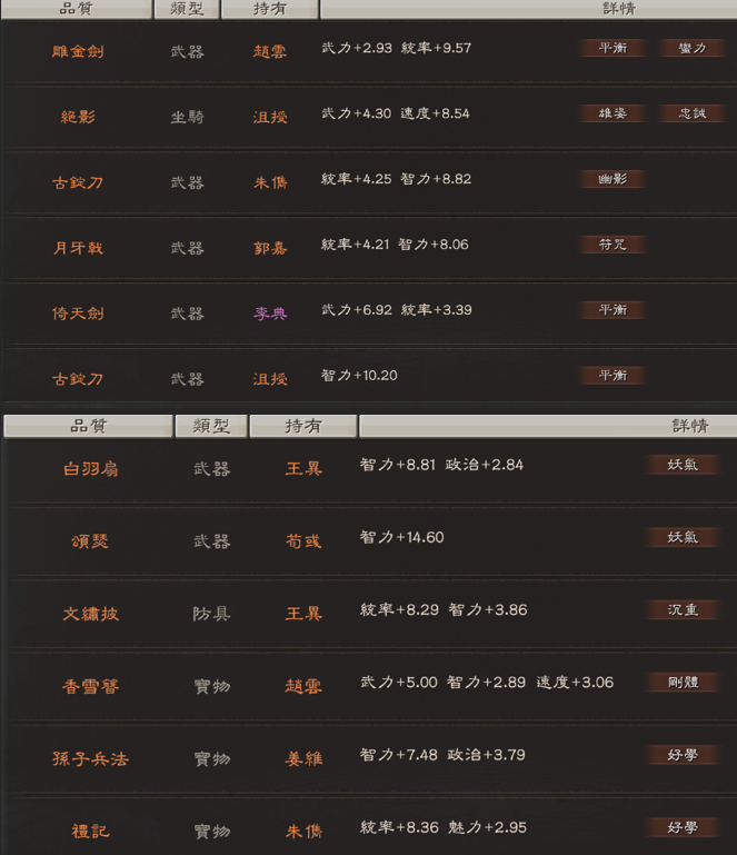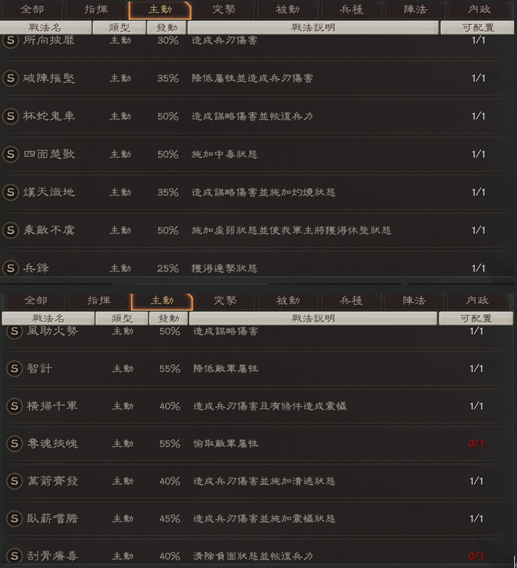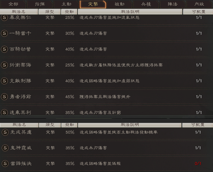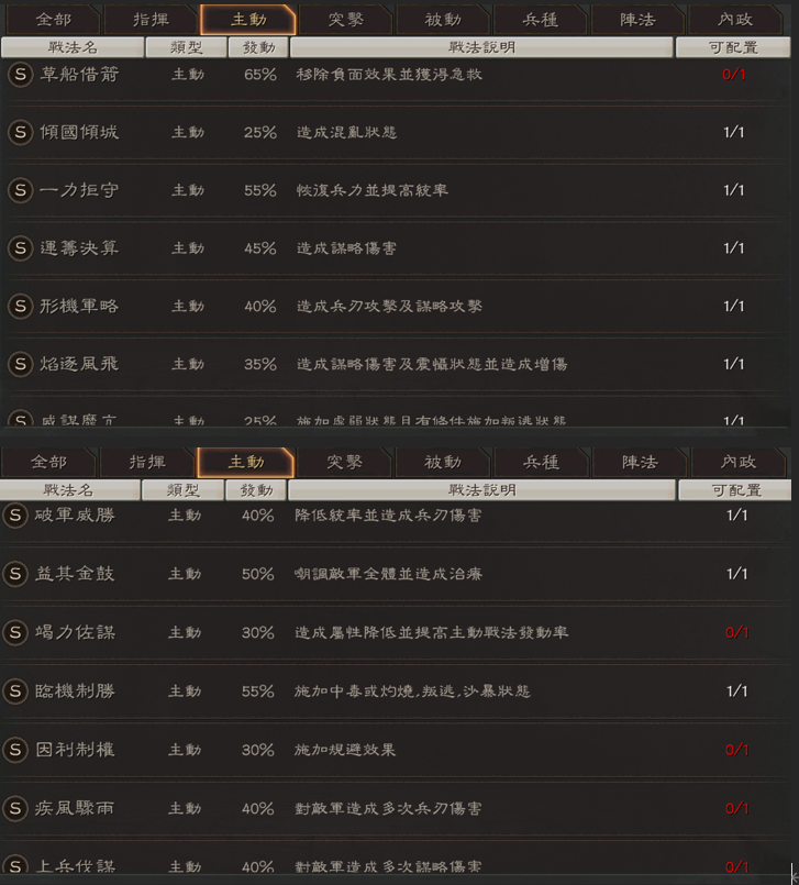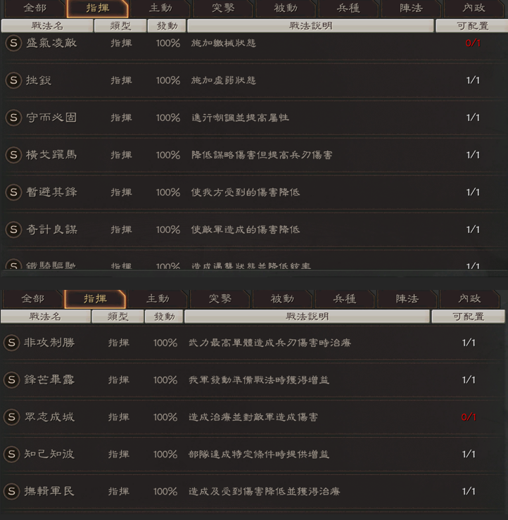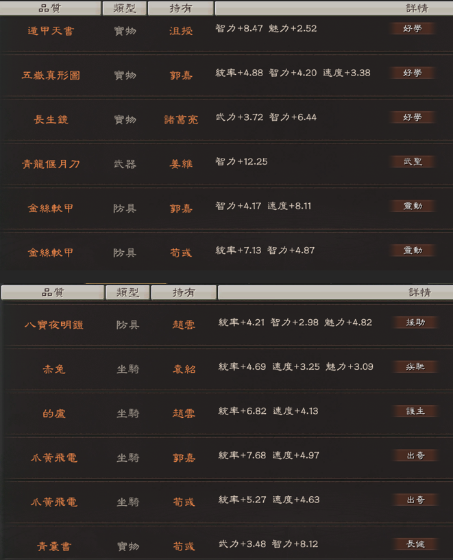 裝備:1剛體 6好學 1武聖 2靈動 1援助 1護主 2出奇 1長健 1號令 1無懼幽影(雙特技) 1龍讓