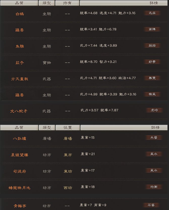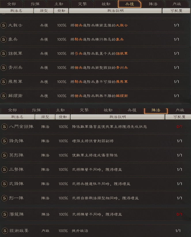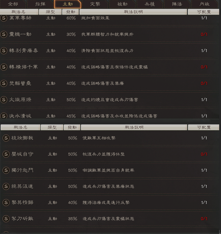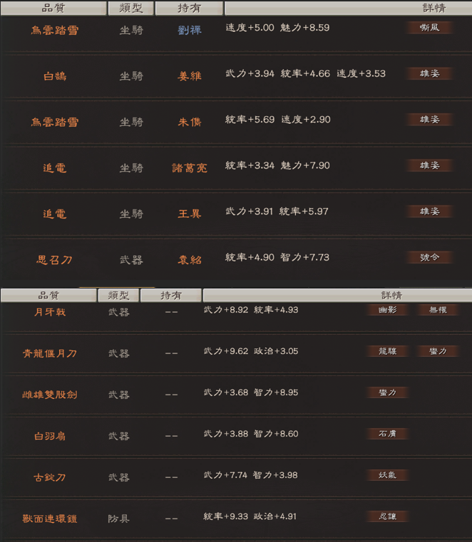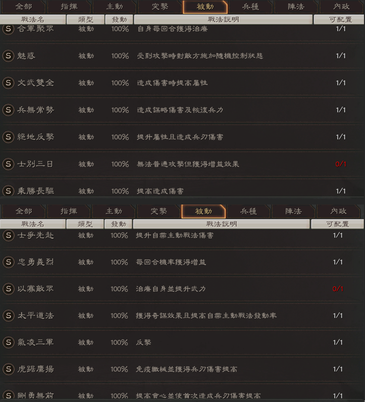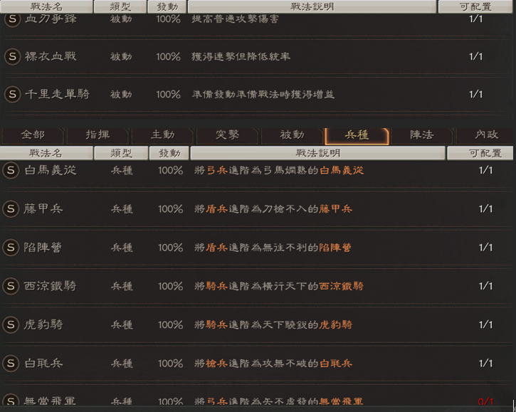 裝備:1剛體 6好學 1武聖 2靈動 1援助 1護主 2出奇 1長健 1號令 1無懼幽影(雙特技) 1龍讓