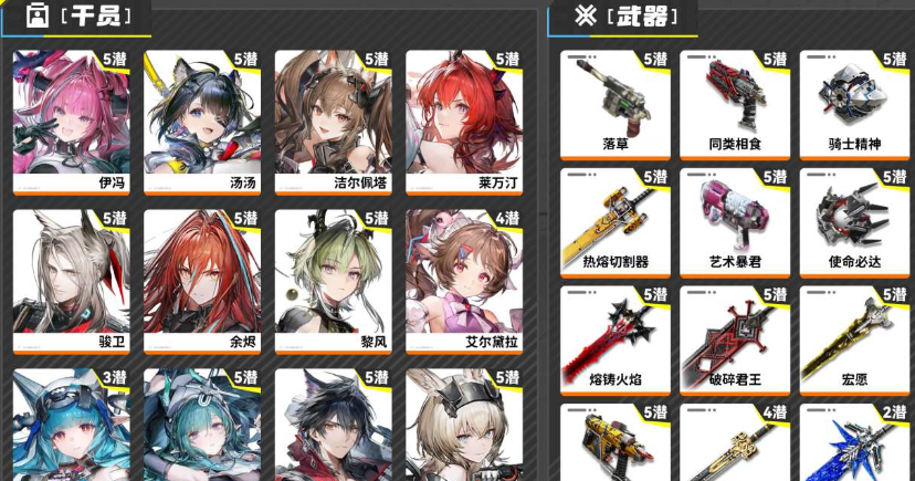 57級,29橙,六星角色8個,武器配額6960,源石9,晶玉6320;角色:壹潛別禮,壹潛伊馮,壹潛潔爾佩塔,壹潛黎風,萊萬汀,伊馮,別禮,艾爾黛拉,潔爾佩塔,駿衛,黎風,湯湯;武器:二潛楔子,壹潛熱熔切割器,熔鑄火焰,熱熔切割器,同類相食,宏願,赫拉芬格,典範,藝術暴君,楔子,使命必達,滄溟星夢,爆破單元,騎士精神,