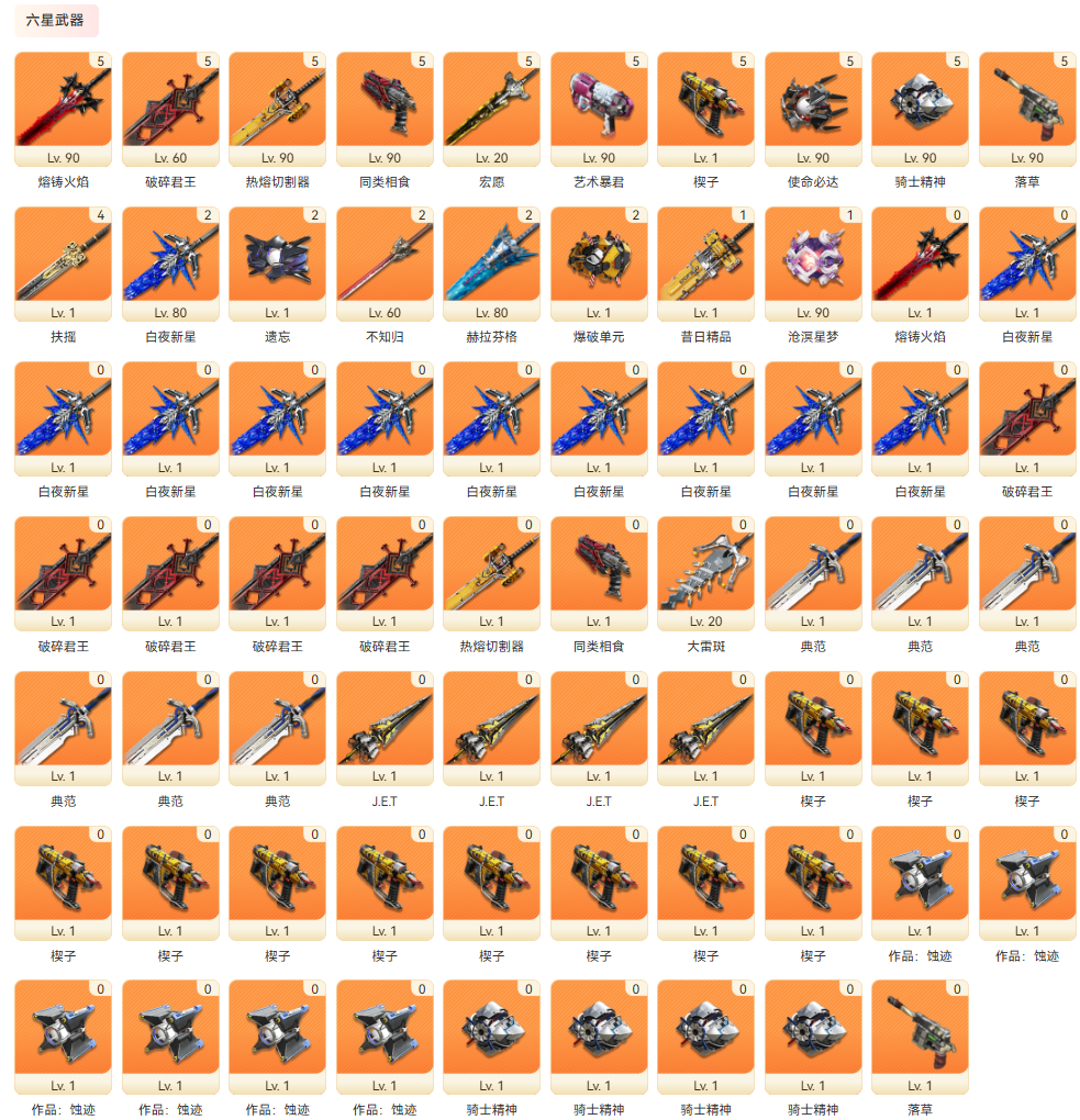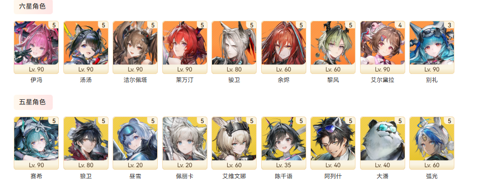 權限等級:58,總橙數:25,六星幹員數量:7,六星武器數量:12,衍質源石:165,嵌晶玉:9835;特許尋訪憑證:2,武庫配額:1840,六星幹員:二潛艾爾黛拉,壹潛伊馮,壹潛駿衛,萊萬汀,潔爾佩塔,湯湯,別禮;六星武器:壹潛熔鑄火焰,壹潛滄溟星夢,藝術暴君,同類相食,熱熔切割器,宏願,不知歸,赫拉芬格,騎士精神,