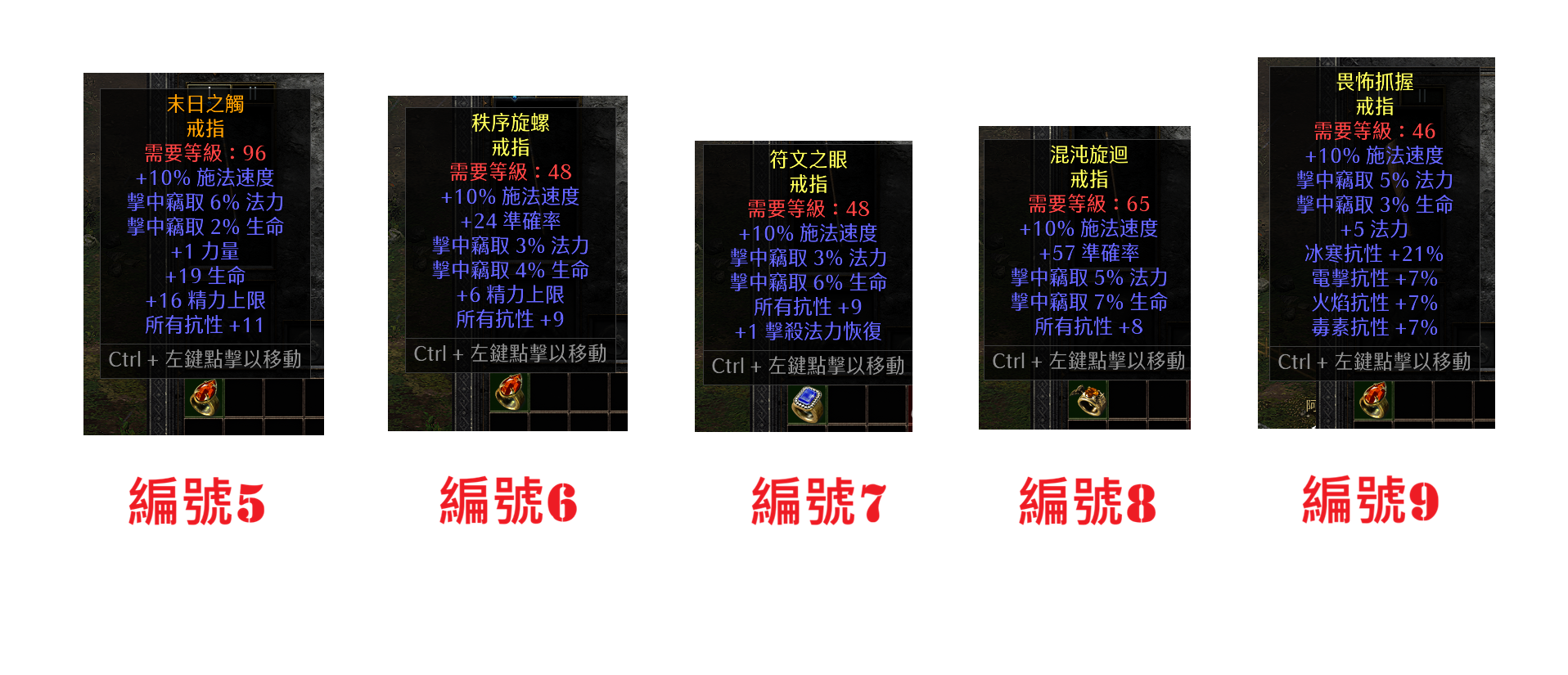 戒指9:10%高施+3%偷血+5%偷法力+7全抗爆冰抗21%+5法