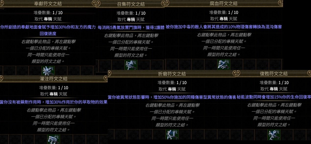 道具 符文之結專精天賦👍奉獻魔力、召集鬥旗護體腐血中毒混沌灌注萃取物折磨復甦秘能波動