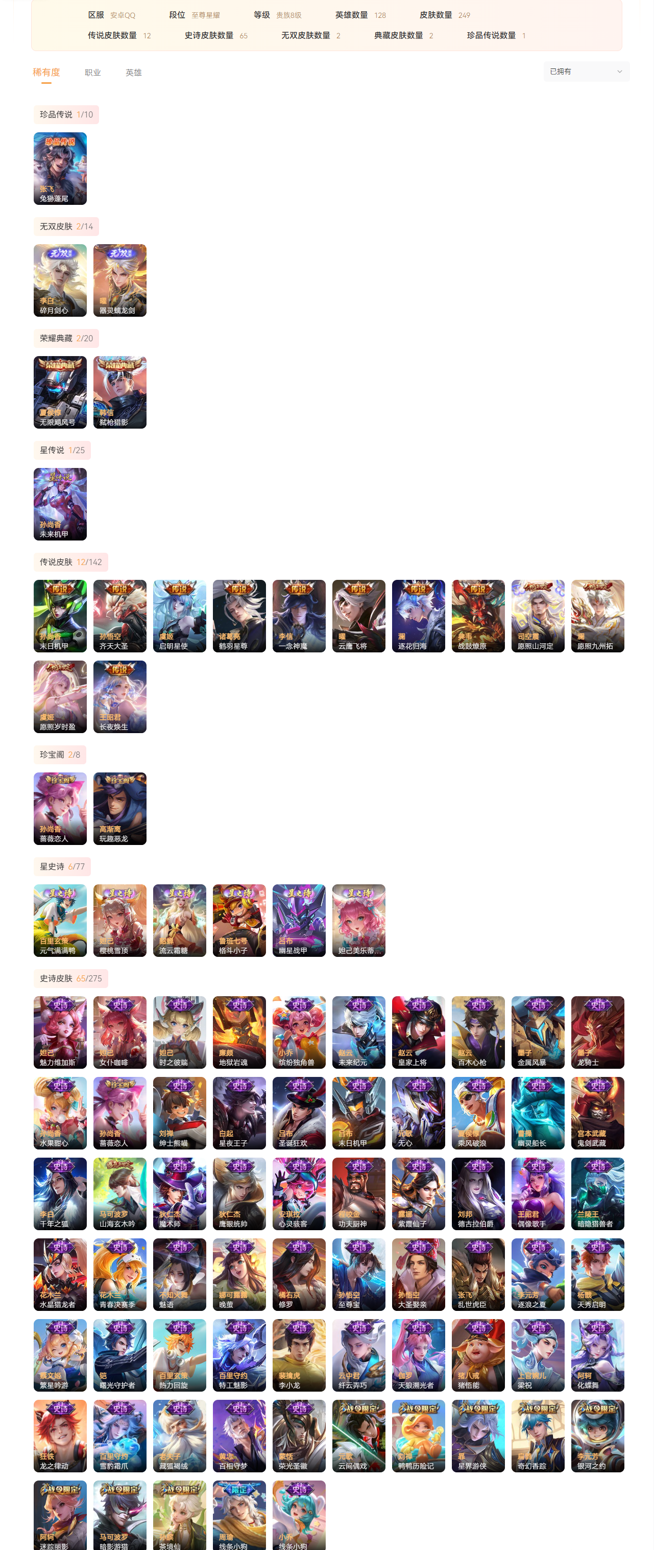【WPAZD9674】贵族8级,249皮肤,0水晶,1珍品传说,2典藏,2无双,12传说,19星元,65史诗,22个性按键,皮肤价值:189780