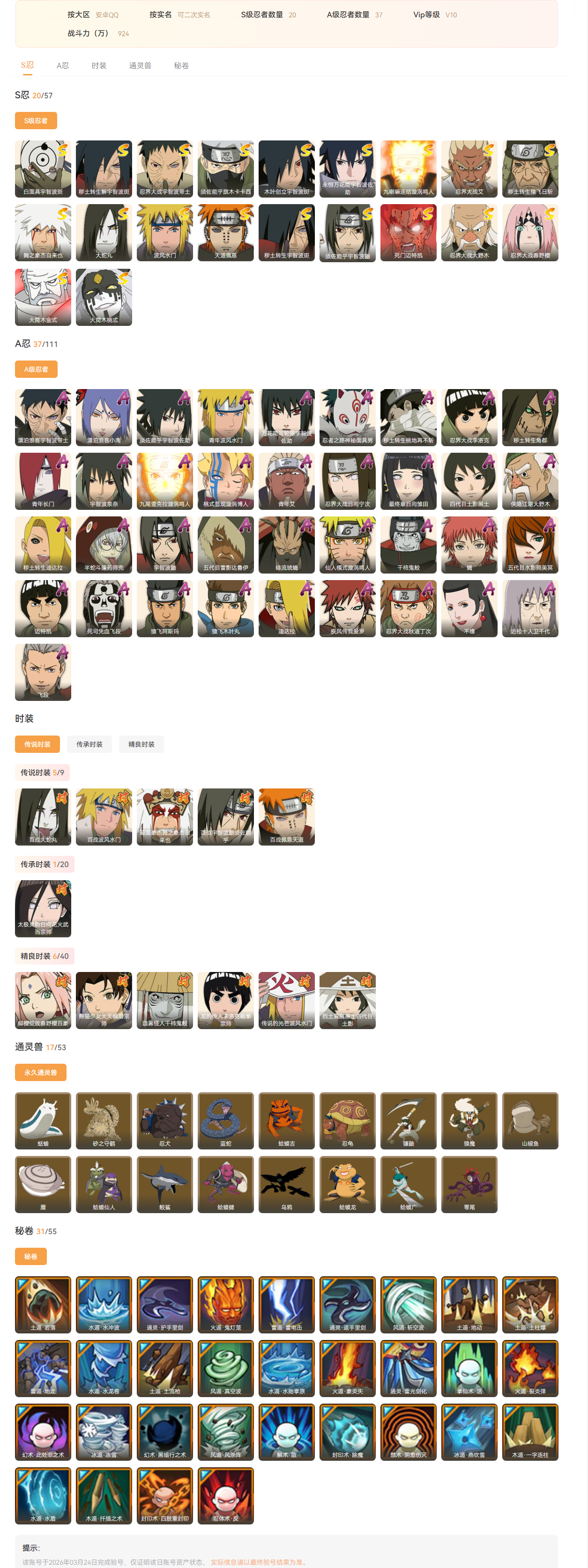 【HAWAH0920】S忍20个;A忍37个;时装12个;通灵兽17个;秘卷31个;战斗力:924W+;主场景0个;段位:见习1阶;本服排名:423;战区排名:未上榜;VIP10级;S忍:秽土转生解宇智波斑,白面具宇智波斑,忍界大战宇智波带土,须佐能乎旗木卡卡西,天道佩恩,木叶创立宇智波斑,永恒万花筒宇智波佐助,忍界大战艾,舞之豪杰自来也,大蛇丸,波风水门,秽土转生宇智波斑,须佐能乎宇智波鼬,死门迈特凯,忍界大战大野木,忍界大战春野樱,九喇嘛连结漩涡鸣人,大筒木金式,大筒木桃式,秽土转生猿飞日斩;A忍:漂泊浪客宇智波带土,忍界大战李洛克,秽土转生角都,忍界大战日向宁次,四代目土影黑土,猿飞木叶丸,青年长门,忍者之路神秘面具男,秽土转生迪达拉,青年波风水门,青年艾,近松十人卫千代,半蛇斗篷药师兜,须佐能乎宇智波佐助,九尾查克拉漩涡鸣人,忍界大战秋道丁次,万花筒写轮眼宇智波佐助,五代目水影照美冥,五代目雷影达鲁伊,死司凭血飞段,疾风传我爱罗(4星),迪达拉,飞段(3星),漂泊浪客小南,仙人模式漩涡鸣人,迈特凯(5星),宇智波鼬,干柿鬼鲛(5星),秽土转生桃地再不斩,蝎(3星),绯流琥蝎,猿飞阿斯玛(4星),桃式显现漩涡博人,最终章日向雏田,不缘,宇智波泉奈,侠隐江湖大野木;通灵兽:忍犬,蓝蛇,蛤蟆吉,忍龟,镰鼬,猿魔,山椒鱼,蜃,蛤蟆仙人,鲛鲨,砂之守鹤,蛤蟆健,乌鸦,蛞蝓,蛤蟆龙,蛤蟆广,零尾;时装:百战波风水门,蜀面豪杰舞之豪杰自来也,百战佩恩天道,百战大蛇丸,百战宇智波鼬须佐能乎,太极灵韵日向花火武当宗师,龙的传人李洛克截拳宗师,绯樱绽放春野樱百豪,血雾怪人干柿鬼鲛,传说的光芒波风水门,熊猫少女天天峨眉宗师,烈土霓裳黑土四代目土影;秘卷:风遁·真空波,土遁·地动,土遁·土柱爆,土遁·岩落,水遁·水贻拿原,通灵·护手里剑,风遁·斩空波,雷遁·地走,通灵·返手里剑,水遁·水龙卷,火遁·鬼灯笼,水遁·水冲波,火遁·豪炎失,土遁·土流枪,雷遁·雷电击,木遁·扦插之术,幻术·黑暗行之术,封印术·四肢重封印,忍体术·反,冰遁·冻雪,冰遁·燕吹雪,木遁·一字连柱,掌仙术·活,幻术·此处非之术,通灵·雷光剑化,禁术·阴愈伤灭,解术·散,火遁·裂炎弹,封印术·除魔,水遁·水盾,风遁·风杀阵