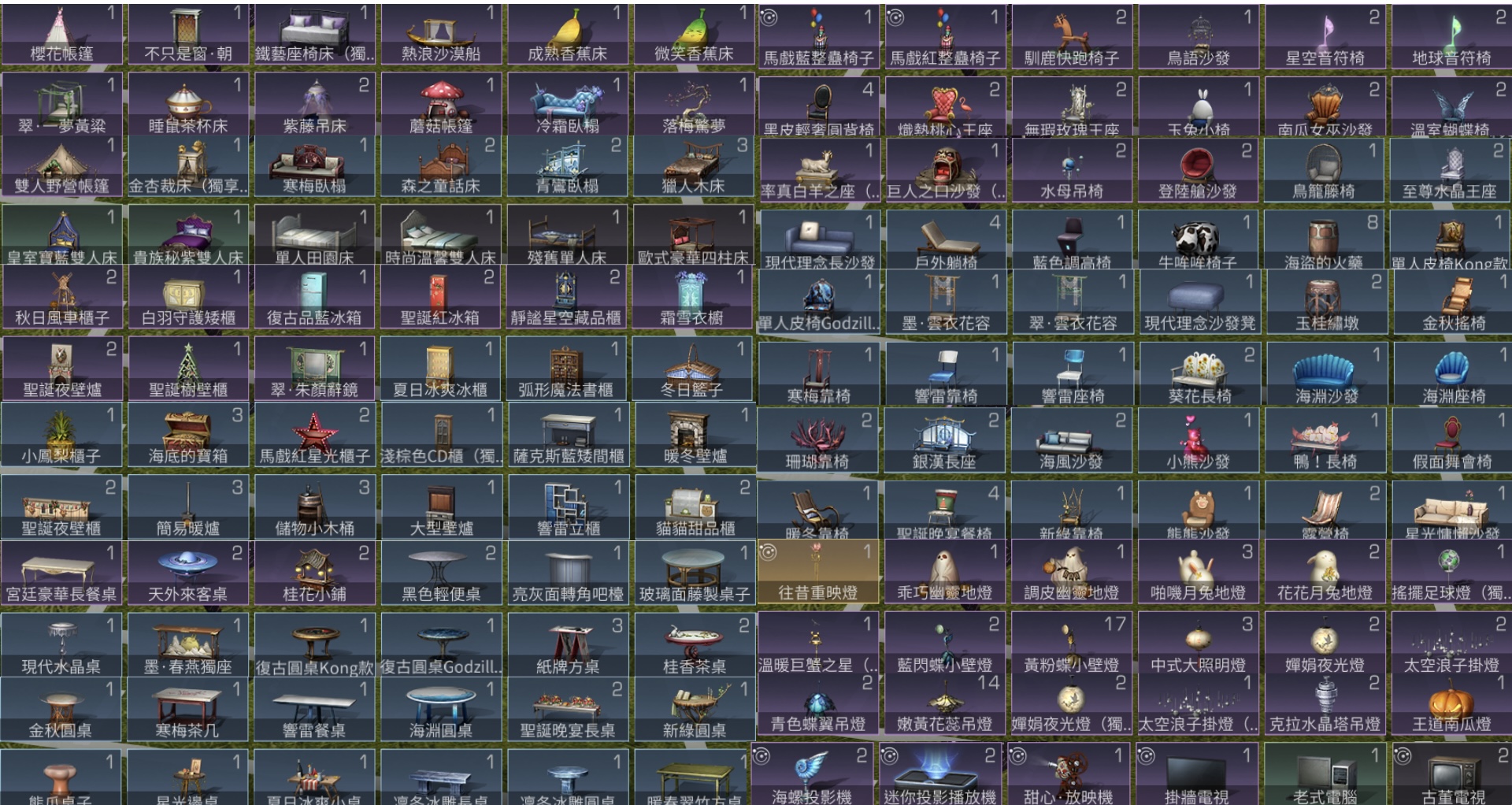 【999等】售長平家俱 500-紫200-藍100 一些稀有家俱另計價