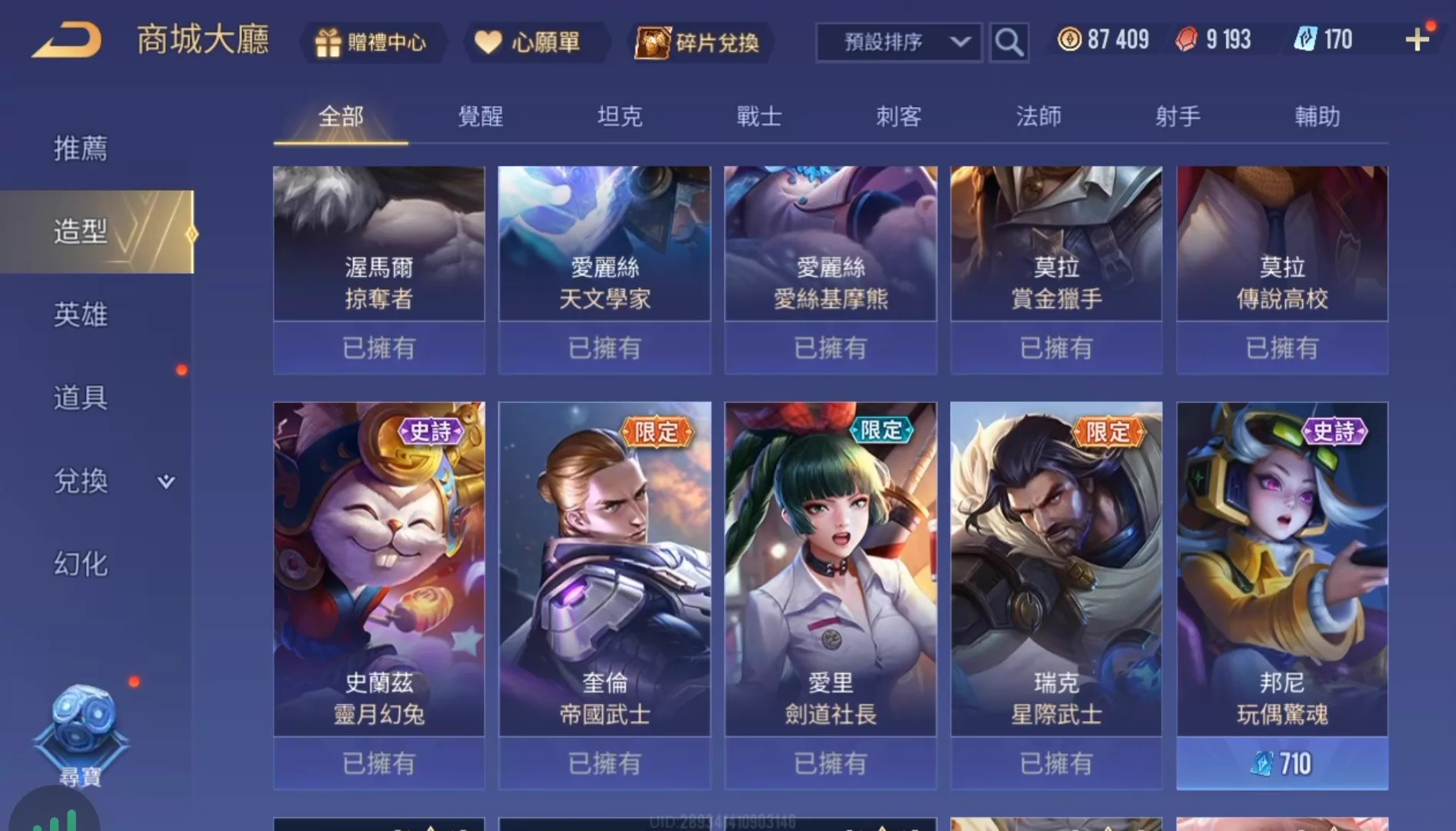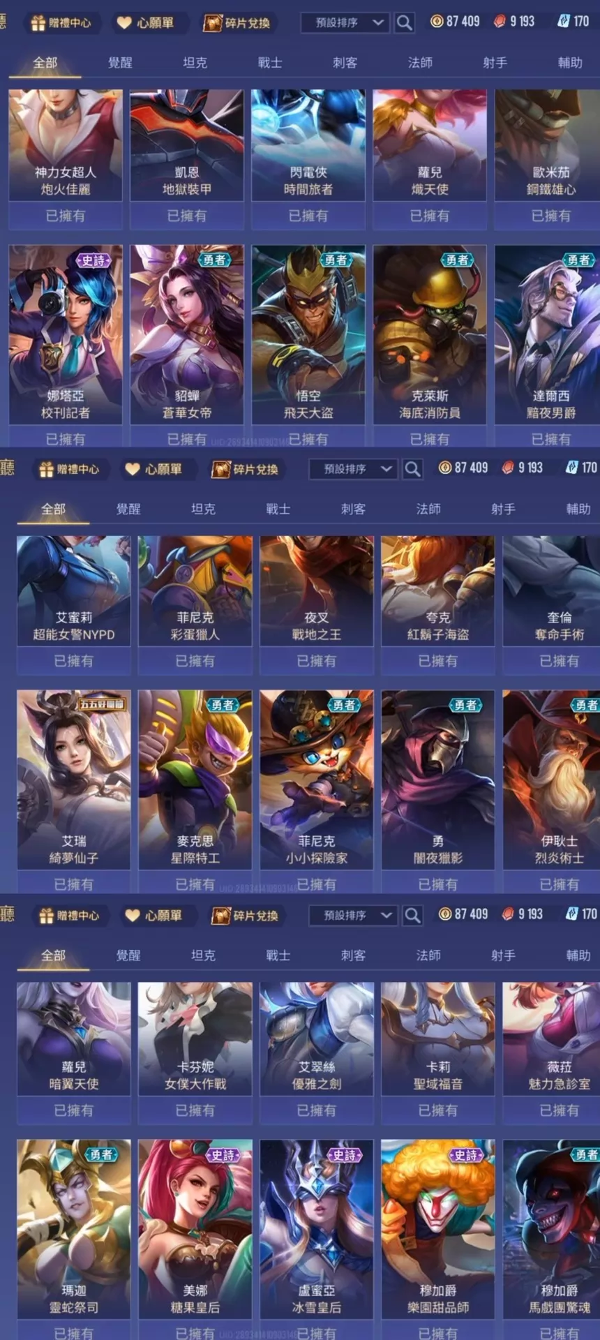 傳說對決台服帳 65英雄92造型 8.7萬金幣 可改名 無綁定可換綁改密 奧義90 garena登入 安卓蘋果都可以