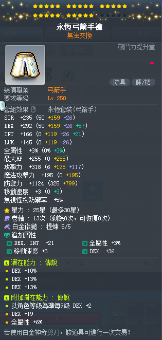 【永恆弓箭手褲】 雙傳25星36%敏永恆弓箭手褲 附加2.5排 白5全B~