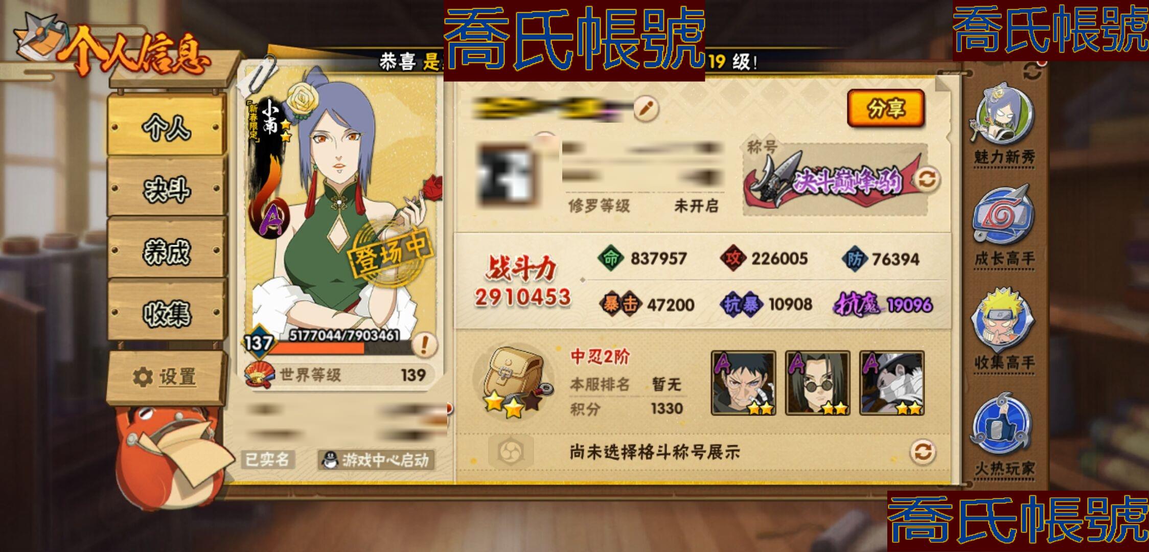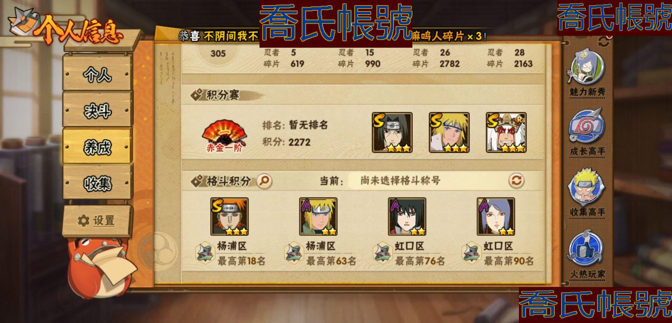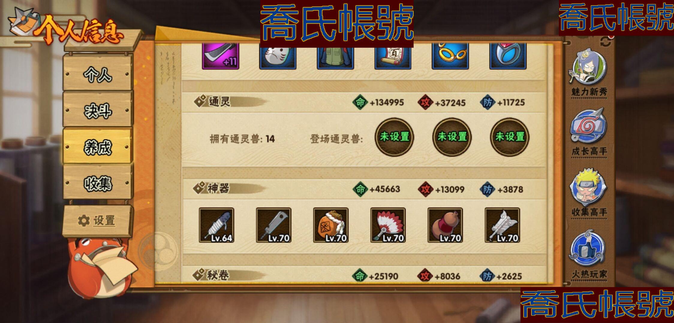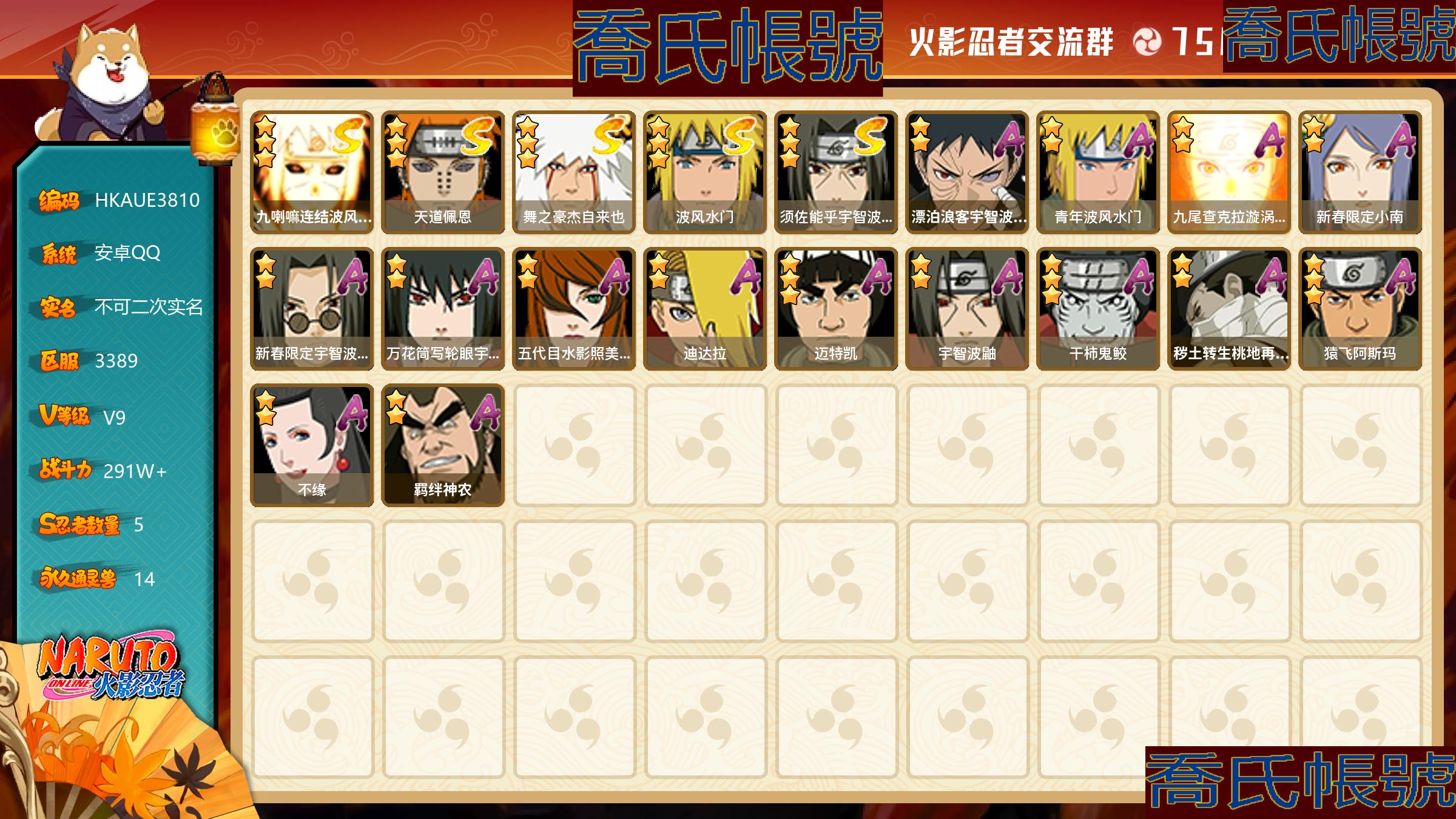 【OBHKAUE381042】S忍5個;A忍15個;時裝5個;通靈獸14個;秘卷40個;戰鬥力:291W+;主場景1個;段位:中忍2階;本服排名:4483;戰區排名:未上榜;VIP9級;S忍:九喇嘛連結波風水門,天道佩恩,舞之豪傑自來也,波風水門,須佐能乎宇智波鼬;A忍:漂泊浪客宇智波帶土,青年波風水門,九尾查克拉漩渦鳴人,新春限定小南,新春限定宇智波鼬,萬花筒寫輪眼宇智波佐助,五代目水影照美冥,迪達拉,邁特凱(3星),宇智波鼬,幹柿鬼鮫(3星),穢土轉生桃地再不斬,猿飛阿斯瑪(3星),不緣,羈絆神農;通靈獸:忍犬,藍蛇,蛤蟆吉,砂之守鶴,忍龜,鐮鼬,猿魔,山椒魚,蛞蝓,蜃,蛤蟆仙人,鮫鯊,蛤蟆健,熊貓;時裝:蜀面豪傑舞之豪傑自來也,百戰宇智波鼬須佐能乎,百戰佩恩天道,百戰波風水門,太極靈韻日向花火武當宗師;秘卷:風遁·真空波,土遁·地動,土遁·土柱爆,土遁·巖落,水遁·水貽拿原,通靈·護手裡劍,風遁·斬空波,雷遁·地走,通靈·返手裡劍,水遁·水龍捲,火遁·鬼燈籠,水遁·水衝波,火遁·豪炎失,土遁·土流槍,雷遁·雷電擊,木遁·扦插之術,幻術·黑暗行之術,封印術·四肢重封印,忍體術·反,冰遁·凍雪,冰遁·燕吹雪,木遁·一字連柱,掌仙術·活,幻術·此處非之術,通靈·雷光劍化,禁術·陰愈傷滅,解術·散,火遁·裂炎彈,封印術·除魔,水遁·水盾,風遁·風殺陣,解術·復,水遁·霧隱之術,忍體術·御,忍體術·怒,幻術·時間回溯,雷遁·四柱束縛,細患抽離之術,風遁·氣旋,秘卷·查克拉;主場景:博人傳;詳情看圖【3389】【安卓QQ】【不可二次實名】【官方截圖】