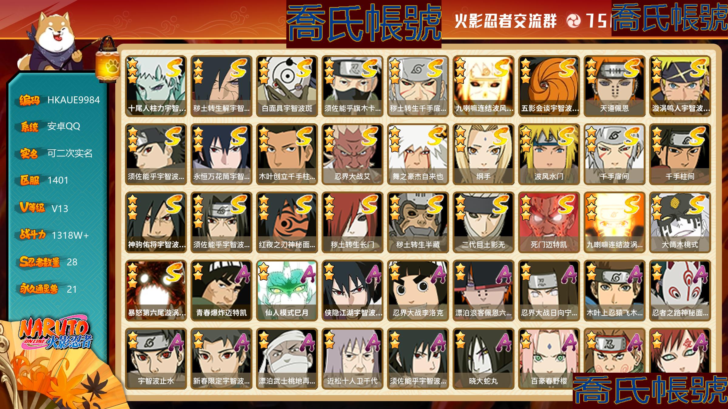 【OBHKAUE998442】S忍28個;A忍42個;時裝17個;通靈獸21個;秘卷47個;戰鬥力:1318W+;主場景1個;段位:上忍3階;本服排名:187 ;戰區排名:未上榜;VIP13級;S忍:十尾人柱力宇智波帶土,穢土轉生解宇智波斑,白面具宇智波斑,須佐能乎旗木卡卡西,穢土轉生千手扉間,九喇嘛連結波風水門,五影會談宇智波斑,天道佩恩,漩渦鳴人宇智波佐助,須佐能乎宇智波止水,永恆萬花筒宇智波佐助,木葉創立千手柱間,忍界大戰艾,舞之豪傑自來也,綱手,波風水門,千手扉間,千手柱間,神駒佑將宇智波斑,須佐能乎宇智波鼬(4星),紅夜之刃神秘面具男,穢土轉生長門,穢土轉生半藏,二代目土影無,死門邁特凱,九喇嘛連結漩渦鳴人,大筒木桃式,暴怒第六尾漩渦鳴人;A忍:青春爆炸邁特凱,仙人模式巳月,俠隱江湖宇智波佐助,忍界大戰李洛克,漂泊浪客佩恩六道,忍界大戰日向寧次,猿飛木葉丸,忍者之路神秘面具男,宇智波止水,新春限定宇智波止水,漂泊武士桃地再不斬,近松十人衛千代,須佐能乎宇智波佐助,曉大蛇丸,百豪春野櫻,忍界大戰秋道丁次,忍界大戰我愛羅,新春限定波風水門,新春限定宇智波鼬,萬花筒寫輪眼宇智波佐助,黑絕,死司憑血飛段,疾風傳我愛羅(3星),迪達拉,飛段(3星),小南,神駒佑將小南,仙人模式漩渦鳴人,神威對決旗木卡卡西,邁特凱(5星),宇智波鼬,幹柿鬼鮫(5星),穢土轉生桃地再不斬,蠍(3星),猿飛阿斯瑪(5星),龍馬精神神駒佑將猿飛阿斯瑪,桃式顯現漩渦博人,六代目水影長十郎,羈絆神農,忍界大戰土臺(3星),初始形態機械鳴人,俠隱江湖大野木;通靈獸:鐮鼬,猿魔,山椒魚,蜃,鮫鯊,烏鴉,蛤蟆龍,蛤蟆廣,蛞蝓,熊貓,夢貘,威裝須佐十週年,豚豚,鷹;時裝:宿命連結漩渦鳴人宇智波佐助,百戰波風水門,蜀面豪傑舞之豪傑自來也,百戰佩恩天道,千祥化福神駒佑將小南,絳雪迎春宇智波鼬,祥烏銜春宇智波鼬,龍馬精神神駒佑將猿飛阿斯瑪,燼影絕蹤宇智波佐助俠隱江湖,血霧怪人幹柿鬼鮫,命定之戰宇智波佐助疾風傳,朱霞呈祥神駒佑將小南,飛瀑流泉長十郎六代目水影,熊貓少女天天峨眉宗師,烈火華服宇智波止水新春限定,風之守護我愛羅忍界大戰,可愛睡衣漩渦鳴人;秘卷:土遁·地動,水遁·水龍捲,水遁·水貽拿原,雷遁·雷電擊,火遁·鬼燈籠,火遁·豪炎失,土遁·土柱爆,風遁·真空波,水遁·水衝波,通靈·返手裡劍,土遁·土流槍,雷遁·地走,土遁·巖落,通靈·護手裡劍,風遁·斬空波,通靈·雷光劍化,幻術·此處非之術,木遁·扦插之術,掌仙術·活,風遁·風殺陣,忍體術·反,封印術·四肢重封印,禁術·陰愈傷滅,封印術·除魔,冰遁·燕吹雪,水遁·水盾,木遁·一字連柱,幻術·黑暗行之術,冰遁·凍雪,火遁·裂炎彈,解術·散,水遁·水連彈,忍體術·御,水遁·霧隱之術,水遁·水氣球,忍體術·毅力,細患抽離之術,火遁·火炎陣,解術·復,雷遁·磁暴術,幻術·一葉障,忍體術·怒,風遁·氣旋,雷遁·雷電門,秘卷·查克拉,幻術·時間回溯,雷遁·四柱束縛;主場景:博人傳;詳情看圖【1401】【安卓QQ】【可二次實名】【官方截圖】忍法帖拉滿3次,超哥三週出,大蛇丸也快出,熱門忍者都高勝率