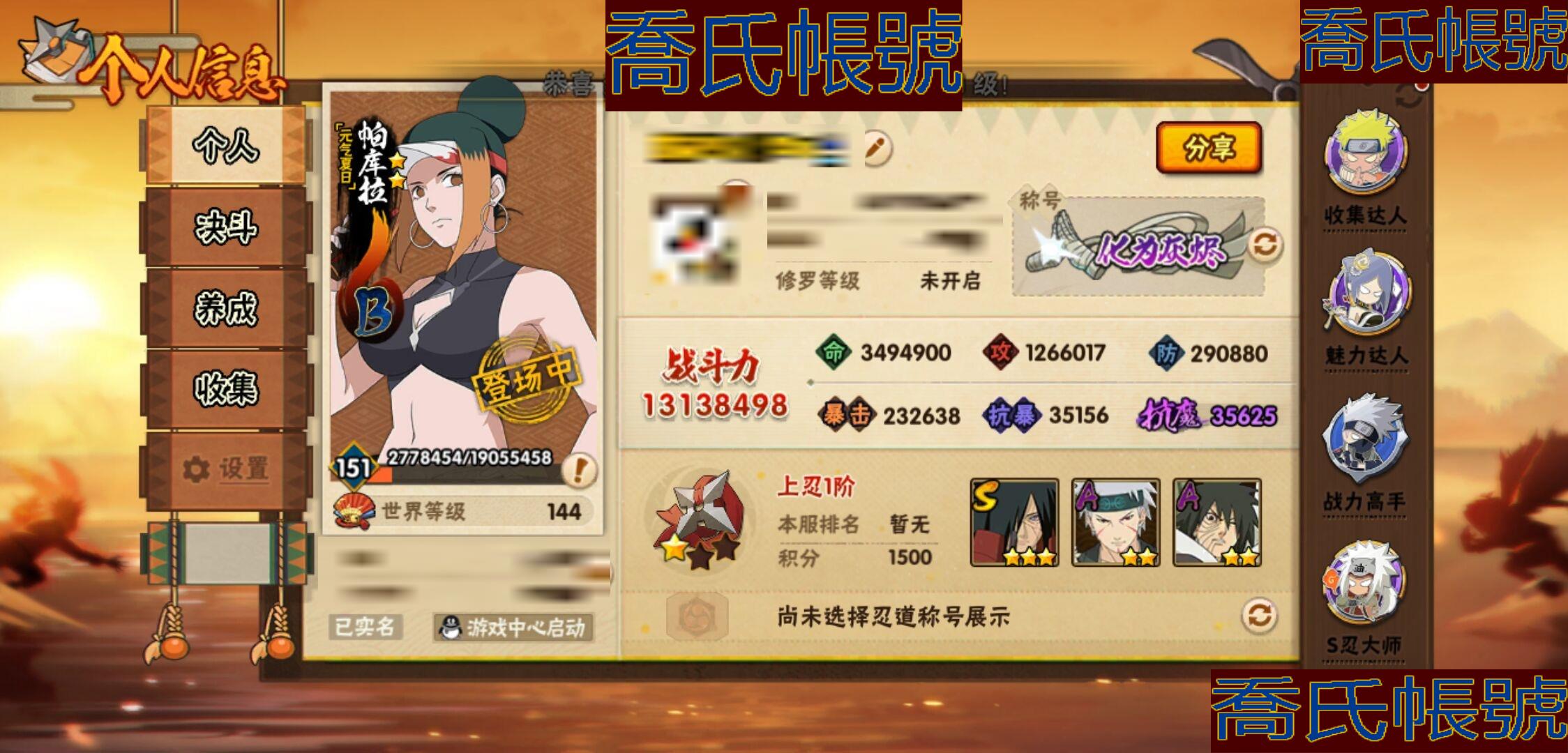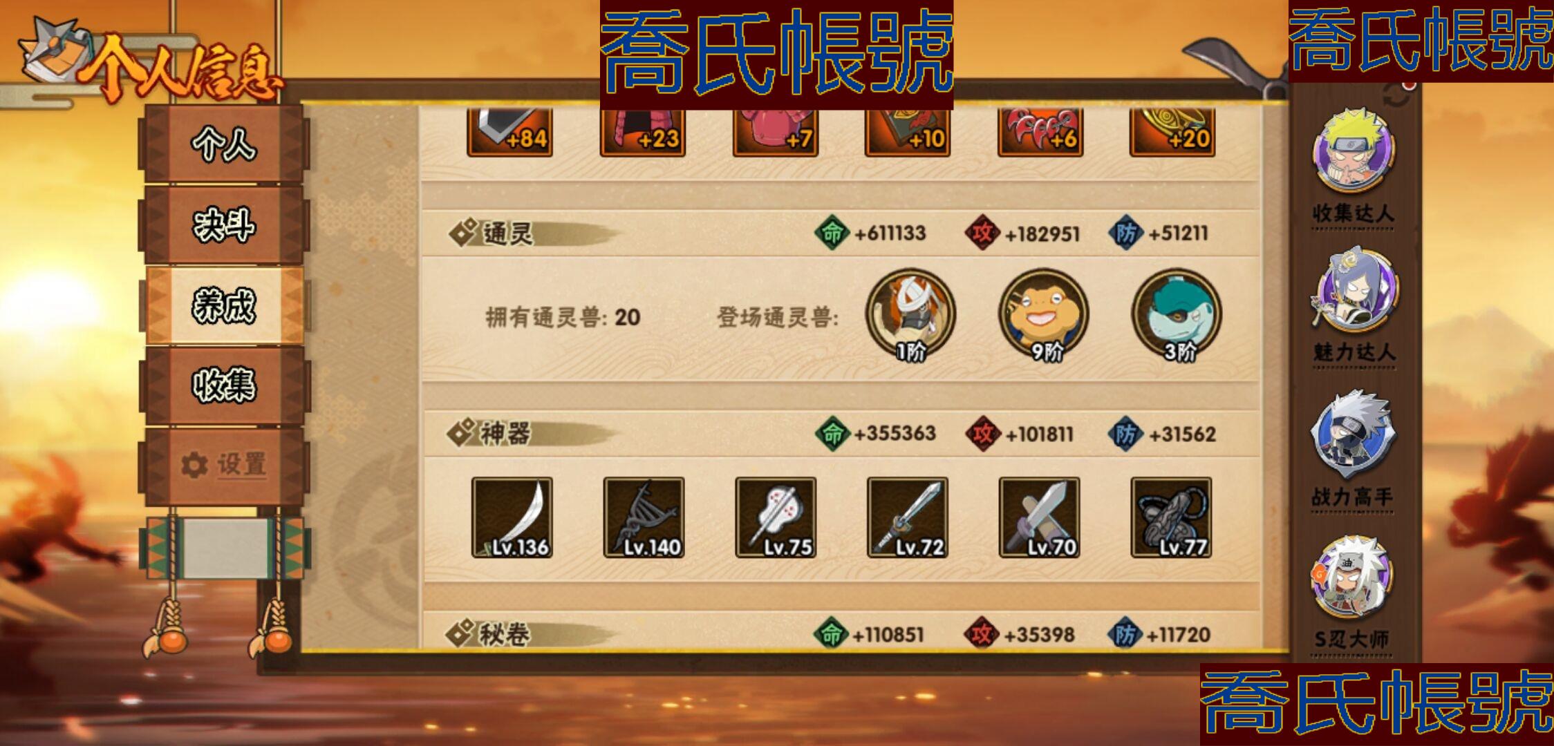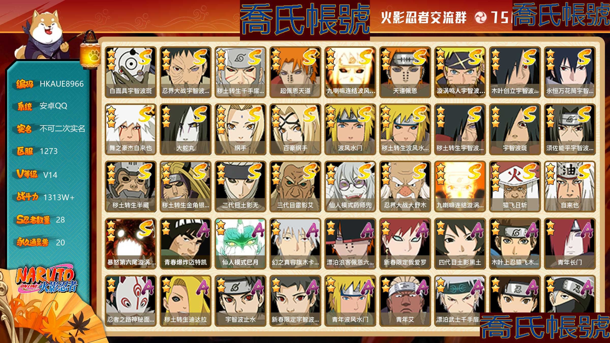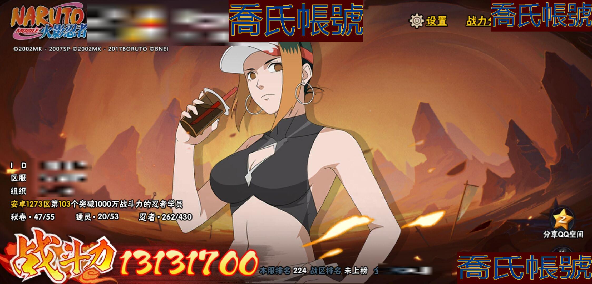 【OBHKAUE896642】S忍28個;A忍62個;時裝21個;通靈獸20個;秘卷47個;戰鬥力:1313W+;主場景1個;段位:上忍1階;本服排名:224;戰區排名:未上榜;VIP14級;S忍:白面具宇智波斑,忍界大戰宇智波帶土,穢土轉生千手扉間,超佩恩天道,九喇嘛連結波風水門,天道佩恩,漩渦鳴人宇智波佐助,木葉創立宇智波斑,永恆萬花筒宇智波佐助,舞之豪傑自來也,大蛇丸,綱手(4星),百豪綱手,波風水門,穢土轉生波風水門,穢土轉生宇智波斑,宇智波斑,須佐能乎宇智波鼬,穢土轉生半藏,穢土轉生金角銀角,二代目土影無,三代目雷影艾,仙人模式藥師兜,忍界大戰大野木,九喇嘛連結漩渦鳴人,猿飛日斬(4星),自來也,暴怒第六尾漩渦鳴人;A忍:青春爆炸邁特凱,仙人模式巳月,幻之真容旗木卡卡西,漂泊浪客佩恩六道,新春限定我愛羅,四代目土影黑土,猿飛木葉丸,青年長門,忍者之路神秘面具男,穢土轉生迪達拉,宇智波止水,新春限定宇智波止水,青年波風水門,青年艾,漂泊武士千手扉間,忍界大戰天天,忍界大戰旗木卡卡西,近松十人衛千代,夏日泳裝照美冥,曉創生角都,半蛇斗篷藥師兜,須佐能乎宇智波佐助,九尾查克拉漩渦鳴人,惡靈之影飛段,暴怒宇智波帶土,忍界大戰秋道丁次,忍界大戰我愛羅,穢土轉生猿飛阿斯瑪,疾風傳咒印宇智波佐助,新春限定宇智波鼬,奇拉比,萬花筒寫輪眼宇智波佐助,五代目水影照美冥,五代目雷影達魯伊,絕,死司憑血飛段,角都,地怨虞角都,疾風傳我愛羅(3星),迪達拉,飛段(4星),阿飛,小南,神駒佑將小南,仙人模式漩渦鳴人,旗木卡卡西,神威對決旗木卡卡西,邁特凱(5星),宇智波鼬,幹柿鬼鮫(4星),穢土轉生桃地再不斬,蠍(5星),緋流琥蠍,猿飛阿斯瑪(5星),最終章日向雛田,六代目水影長十郎,宇智波泉奈,羈絆神農,夏日限定黑土,忍界大戰土臺(3星),初始形態機械鳴人,俠隱江湖大野木;通靈獸:忍犬,藍蛇,蛤蟆吉,忍龜,鐮鼬,猿魔,山椒魚,蜃,蛞蝓,蛤蟆仙人,鮫鯊,蛤蟆健,烏鴉,蛤蟆龍,砂之守鶴,蛤蟆廣,夢貘,威裝須佐十週年,鷹,豚豚;時裝:百戰大蛇丸,宿命連結漩渦鳴人宇智波佐助,蜀面豪傑舞之豪傑自來也,百戰宇智波鼬須佐能乎,百戰佩恩天道,百戰波風水門,斑之附身神秘面具男忍者之路,太極靈韻日向花火武當宗師,滄瀾狂侍佩恩·六道漂泊浪客,編織虛實宇智波鼬,傳說的光芒波風水門,烈火華服宇智波止水新春限定,烈土霓裳黑土四代目土影,朱霞呈祥神駒佑將小南,純白之心白,驚雷掠影達魯伊五代目雷影,驕陽翠羽照美冥夏日泳裝,紅月映雪宇智波鼬新春限定,可愛睡衣漩渦鳴人,智勇記者宇智波佐良娜,龍的傳人李洛克截拳宗師;秘卷:土遁·地動,水遁·水龍捲,水遁·水貽拿原,雷遁·雷電擊,火遁·鬼燈籠,火遁·豪炎失,土遁·土柱爆,風遁·真空波,水遁·水衝波,通靈·返手裡劍,土遁·土流槍,雷遁·地走,土遁·巖落,通靈·護手裡劍,風遁·斬空波,通靈·雷光劍化,幻術·此處非之術,木遁·扦插之術,掌仙術·活,風遁·風殺陣,忍體術·反,封印術·四肢重封印,禁術·陰愈傷滅,封印術·除魔,冰遁·燕吹雪,水遁·水盾,木遁·一字連柱,幻術·黑暗行之術,冰遁·凍雪,火遁·裂炎彈,解術·散,水遁·水連彈,忍法·蛙變之術,忍體術·御,水遁·霧隱之術,冰遁·冰牢,忍體術·毅力,通靈·操手裡劍,細患抽離之術,解術·復,時空間忍術,忍體術·怒,風遁·氣旋,秘卷·查克拉,冰遁·爆雪,幻術·時間回溯,雷遁·四柱束縛;主場景:博人傳;詳情看圖【1273】【安卓QQ】【不可二次實名】【官方截圖】帶土92迪達拉39忍戰零次39其他還有很多