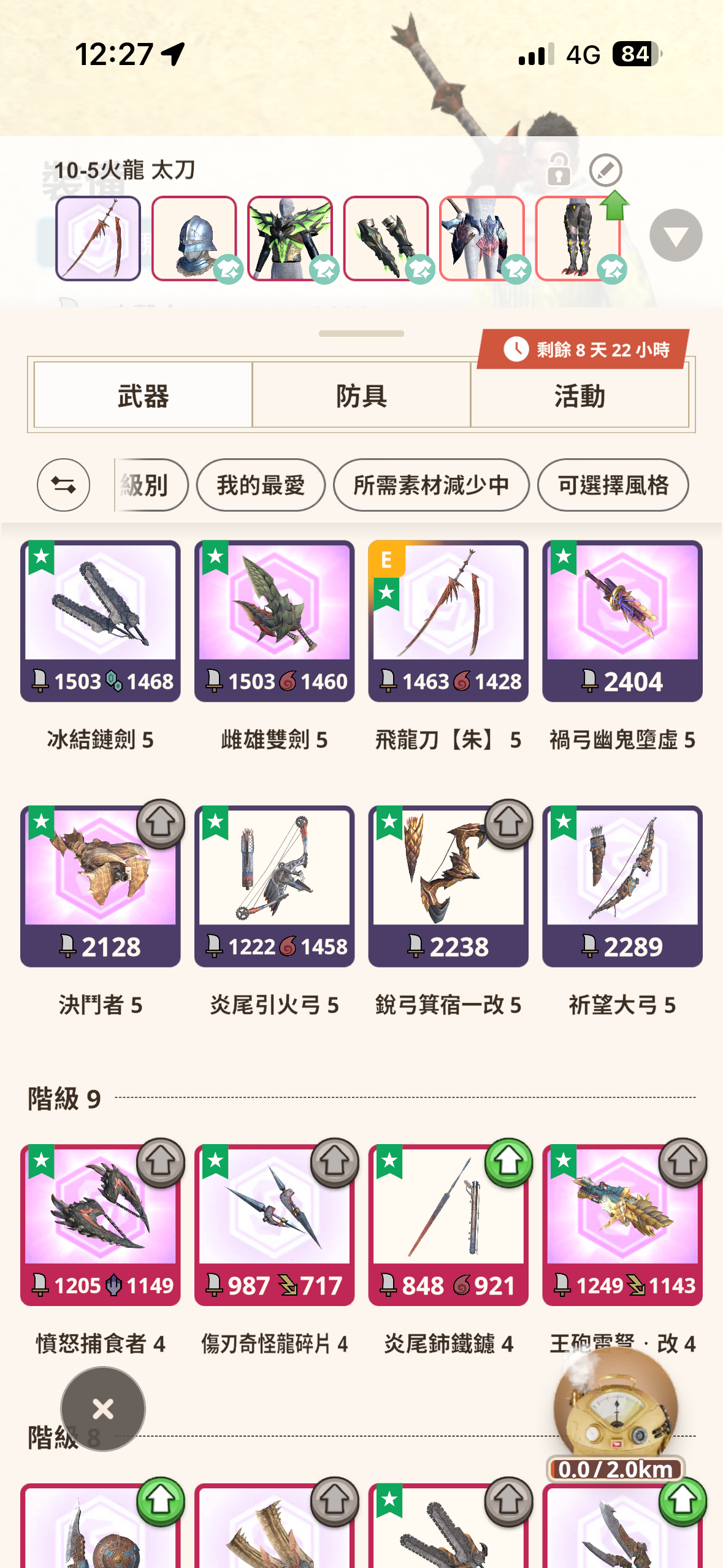 10-5 風漂雙刀、火龍太刀、怨虎輕弩(墊步射)、炎尾弓、希望弓、火龍雙刀(螺旋斬)