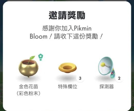 禮包 【四月】 好友邀請碼獎勵 金色花苗*1 特殊欄位*3 探測器*2