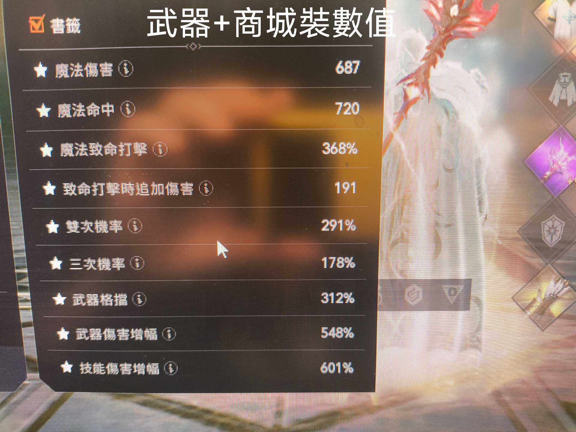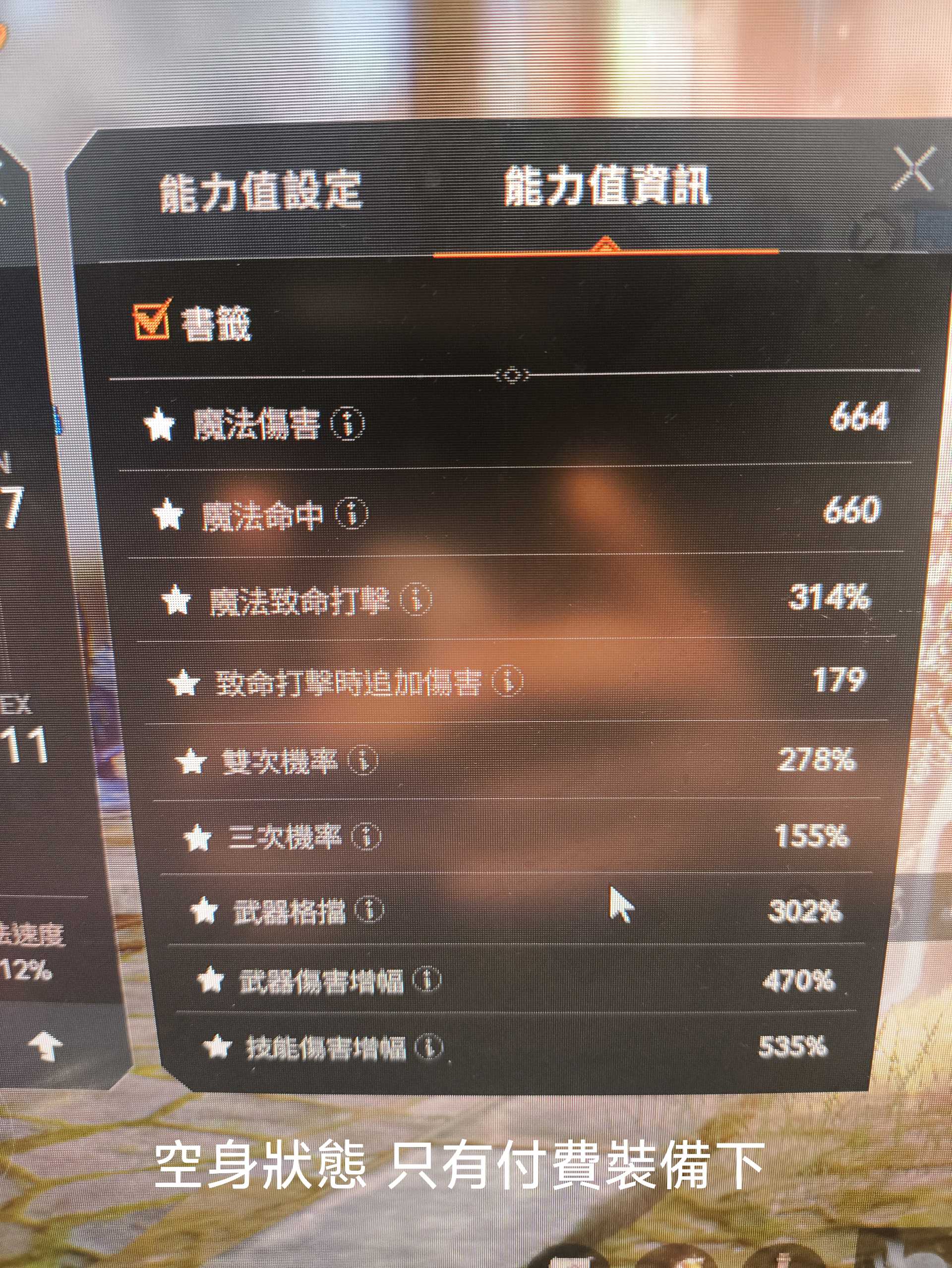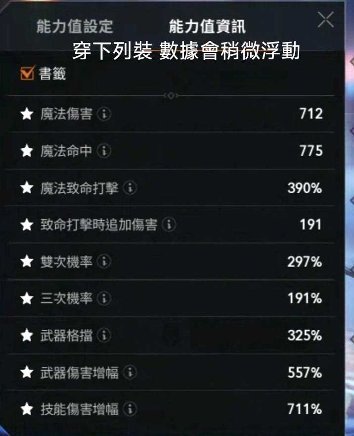 傷害711/命中763/技傷714/衝抗368(穿下列裝,取換裝最大值)