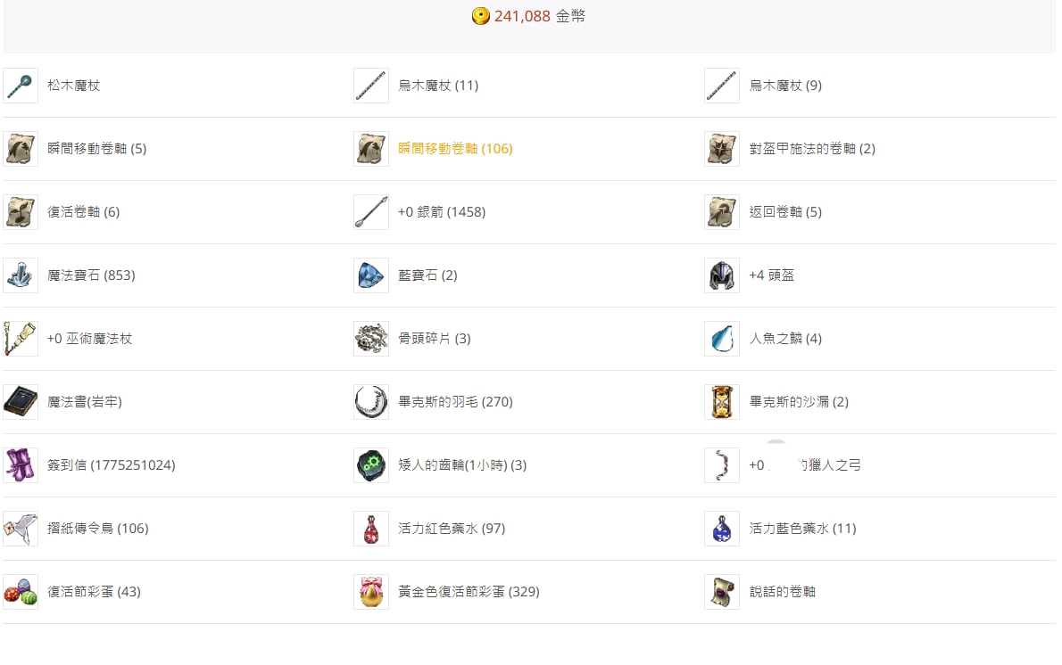 金幣24多萬。魔寶還有850多顆 羽毛270個(沙漏還有13個)防卷二張 倉庫不清。有問題可以發問。