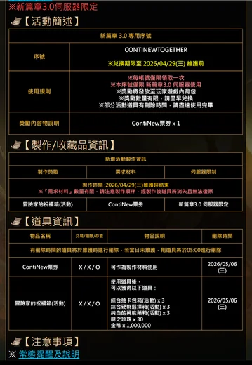 禮包 【ContiNew】 【新篇章3.0】預先創角獎勵90抽