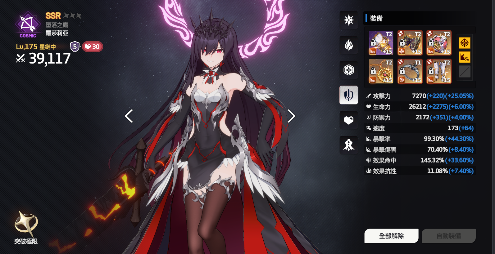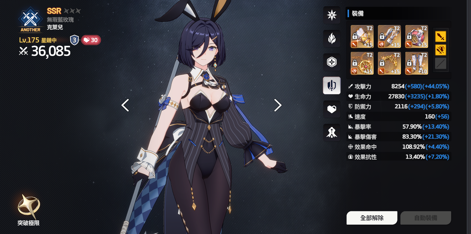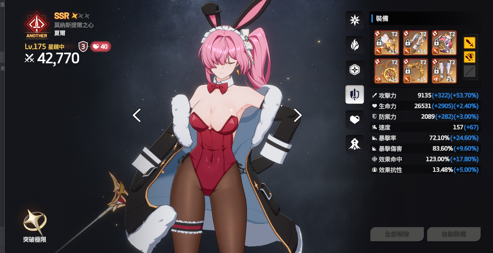 如題 阿爾卡娜缺一張水兔暴擊卡就全畢業 看要不要用PT換 攻擊系的卡片全齊 萬用突破石還沒用 有買雙月卡+通行證 通行證卡片已取得 種馬有40+35的 羅沙檔案詞條更有洞察天賦(+4.5暴) 可以帶出去給輸出點
