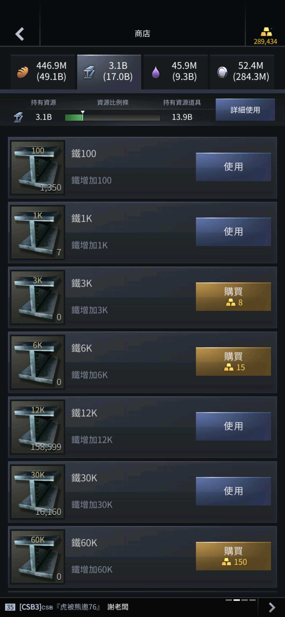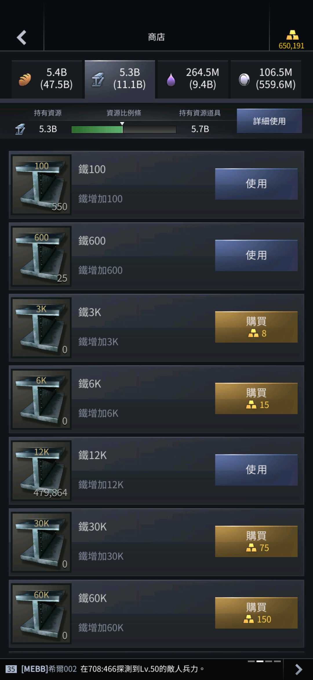 一隻號五個角色各有豐富的鐵資源累積超過50b,其他資源請看圖片!