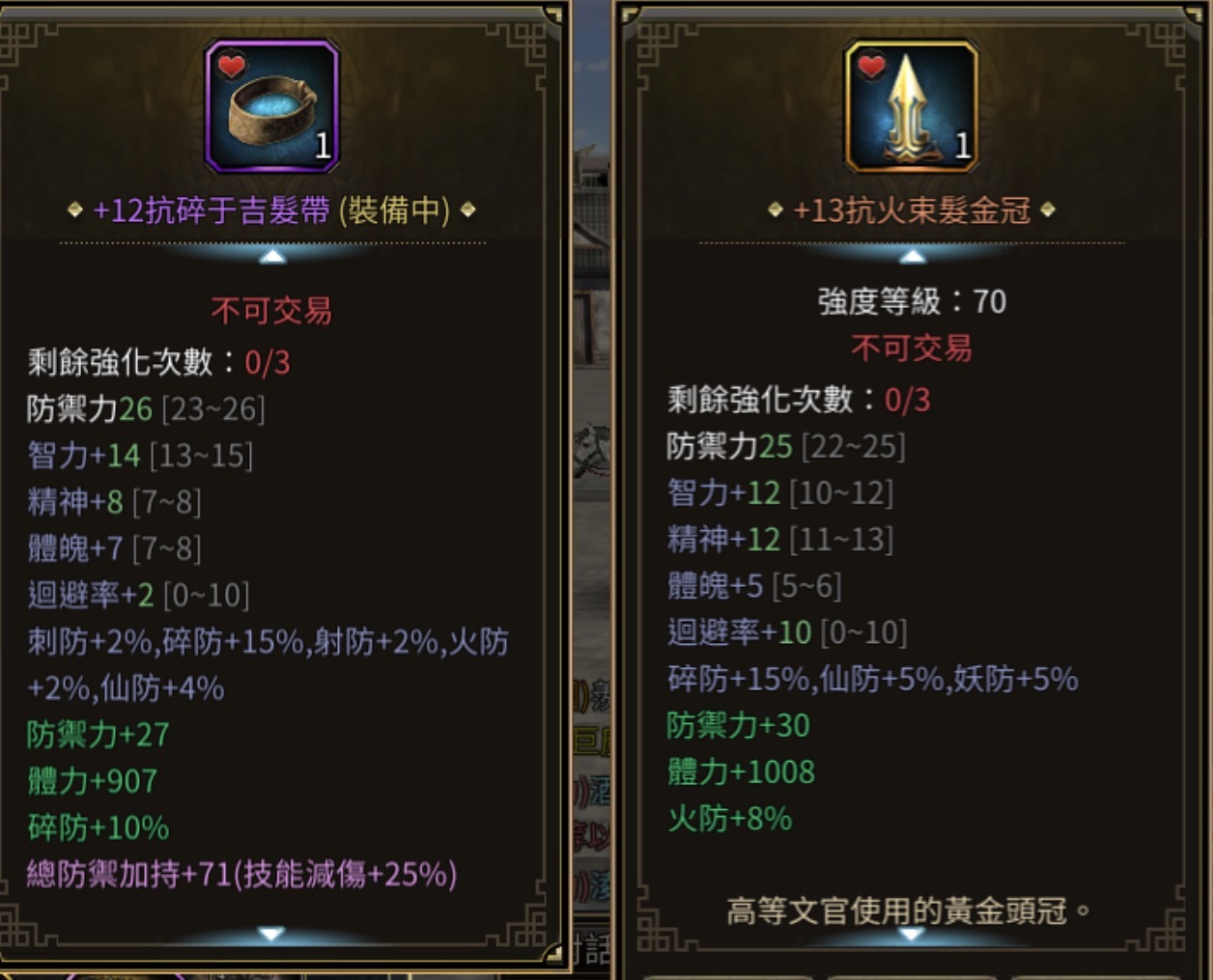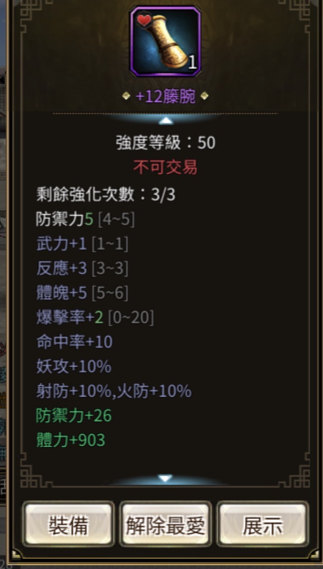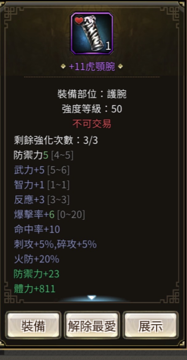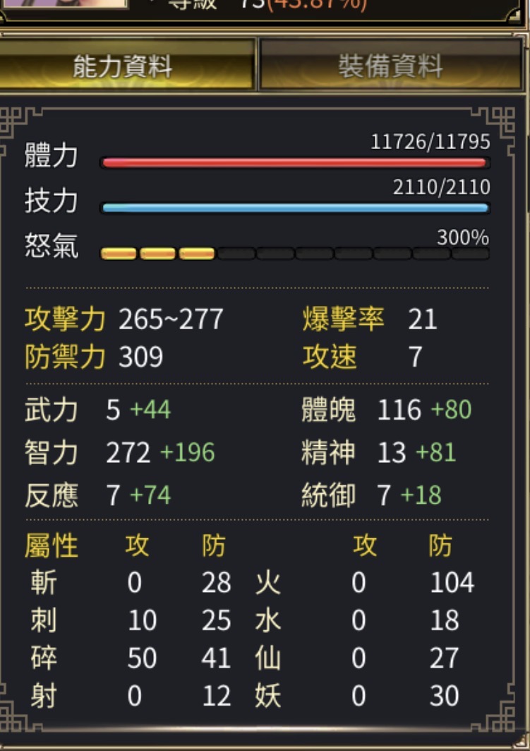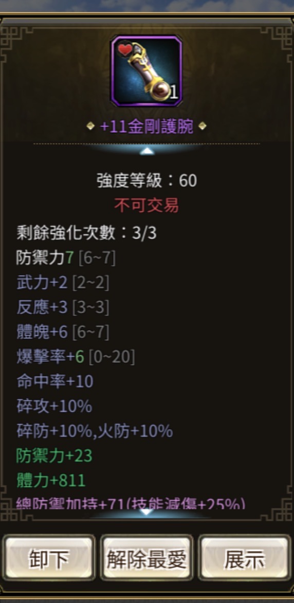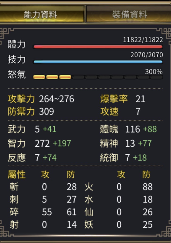 裝備:+11--+13 每件屬防都+10以上