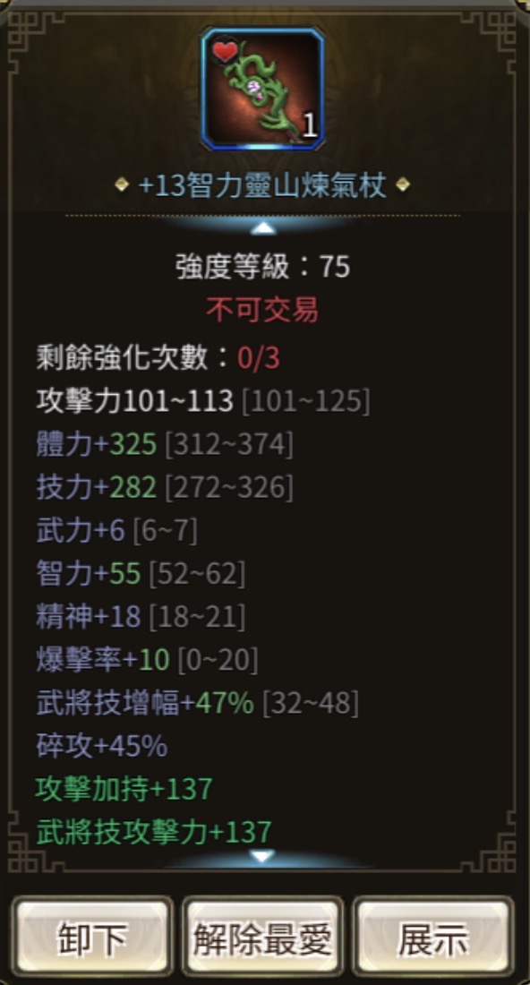 武器:+13 47%靈山杖(綁)