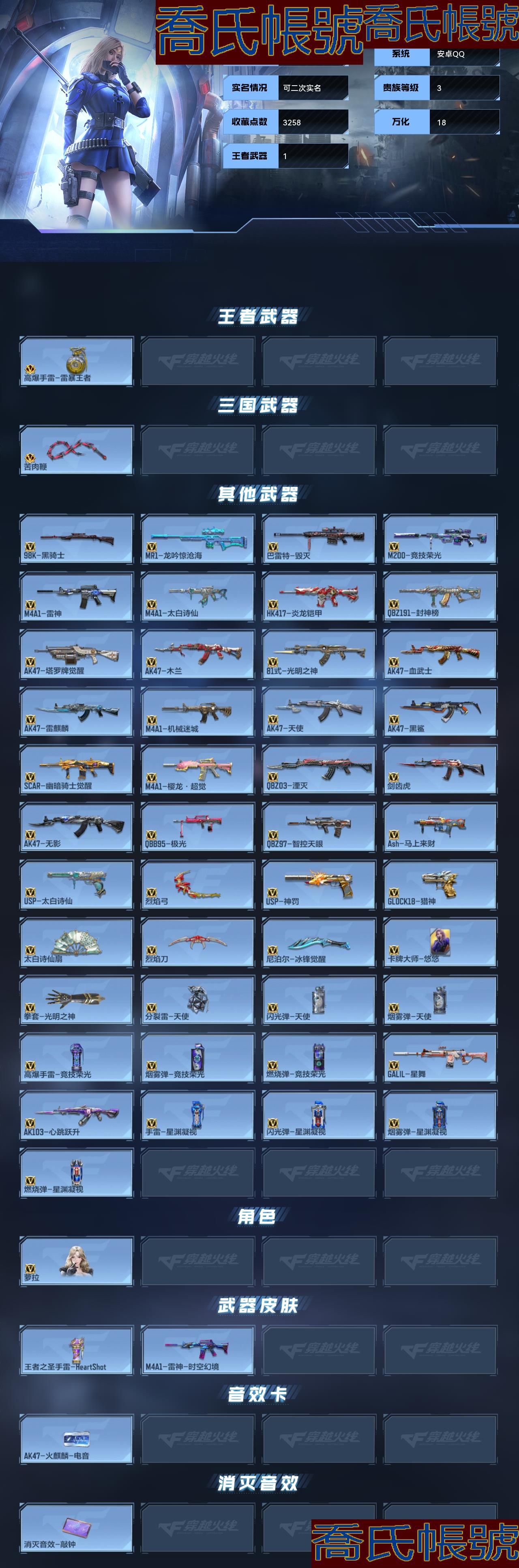 【OBCRVZT726342】6級,VIP3級,高爆手雷-雷暴王者,蘿拉,消滅音效1;【王者武器】:高爆手雷-雷暴王者;【三國武器】:苦肉鞭;【熱門武器】:AK47-天使,AK47-雷麒麟,AK47-無影,AK47-黑鯊,AK47-木蘭,AK47-塔羅牌覺醒,AK47-血武士,劍齒虎,SCAR-幽暗騎士覺醒,M4A1-櫻龍·超覺,QBZ03-湮滅,M4A1-死神,M4A1-太白詩仙,M4A1-機械迷城,M4A1-雷神,AK103-心跳躍升,81式-光明之神,QBZ97-智控天眼,Ash-馬上來財,HK417-炎龍鎧甲,GALIL-星舞,QBZ191-封神榜,98K-黑騎士,USP-神罰,M200-競技榮光,巴雷特-毀滅,QBB95-極光,MR1-龍吟驚滄海,USP-太白詩仙,尼泊爾-冰鋒覺醒,太白詩仙扇,烈焰弓,卡牌大師-悠悠,GLOCK18-獵神,烈焰刀,拳套-光明之神,高爆手雷-競技榮光,手雷-星淵凝視,分裂雷-天使,閃光彈-星淵凝視,煙霧彈-競技榮光,煙霧彈-天使,閃光彈-天使,燃燒彈-競技榮光,煙霧彈-星淵凝視,燃燒彈-星淵凝視;【熱門皮膚】:王者之聖手雷-HeartShot,M4A1-雷神-時空幻境;【稀有道具】:AK47-火麒麟-電音,消滅音效-敲鐘;詳情看圖【官方截圖】【英雄武器包含數量可能含有時效性武器,具體以截圖內實際擁有為主】【安卓QQ】【可二次實名】