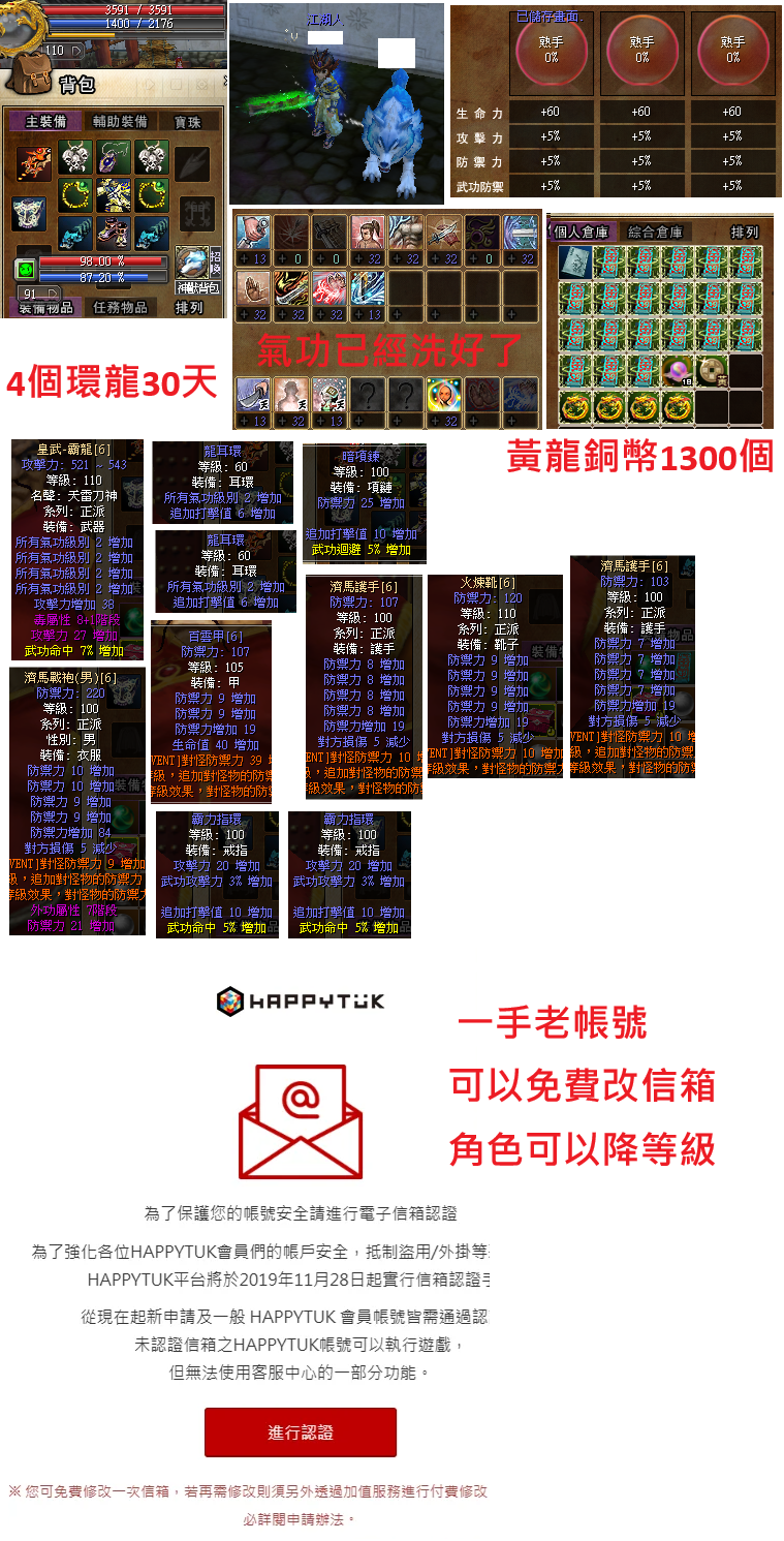 (昇天1正刀)110等(有送裝備雪狼環龍紫霞)(可免費改信箱降等)