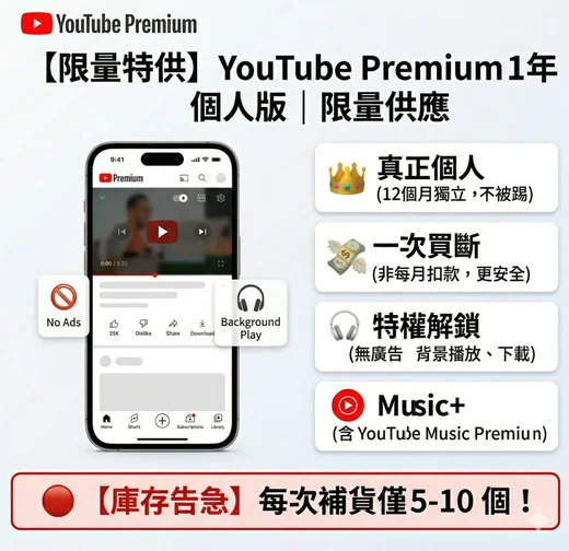 想體驗 YouTube Premium 的優惠嗎?我們家的個人版比家庭版更便宜,而且穩定可靠,不用擔心被踢出!