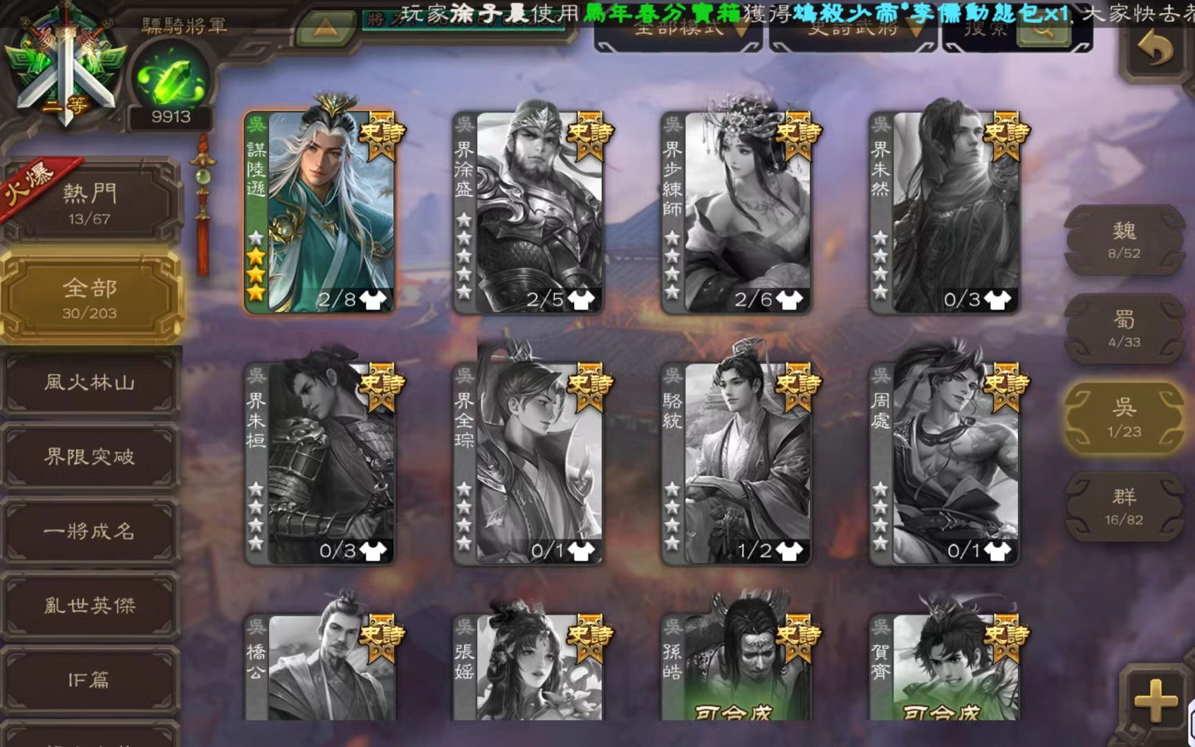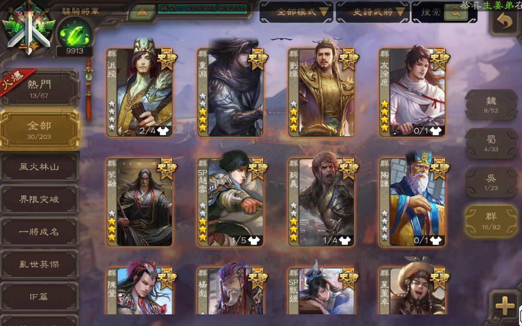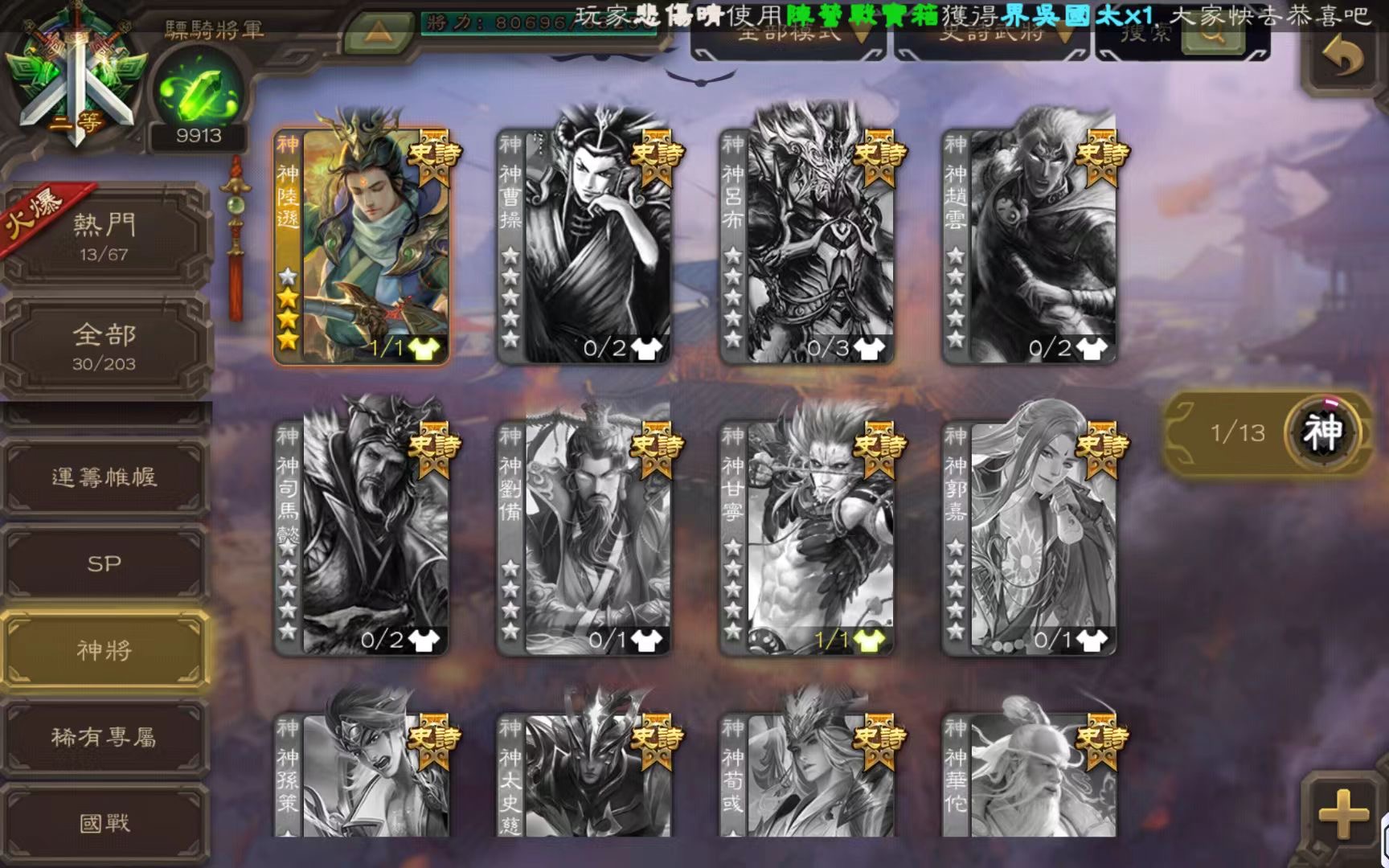 開了至尊奉祿 勢辛憲英47片 結束前可以搞出來 精品謀諸葛瑾 武安國 該有的基本都有 將魂9990 金票70000 如圖所示