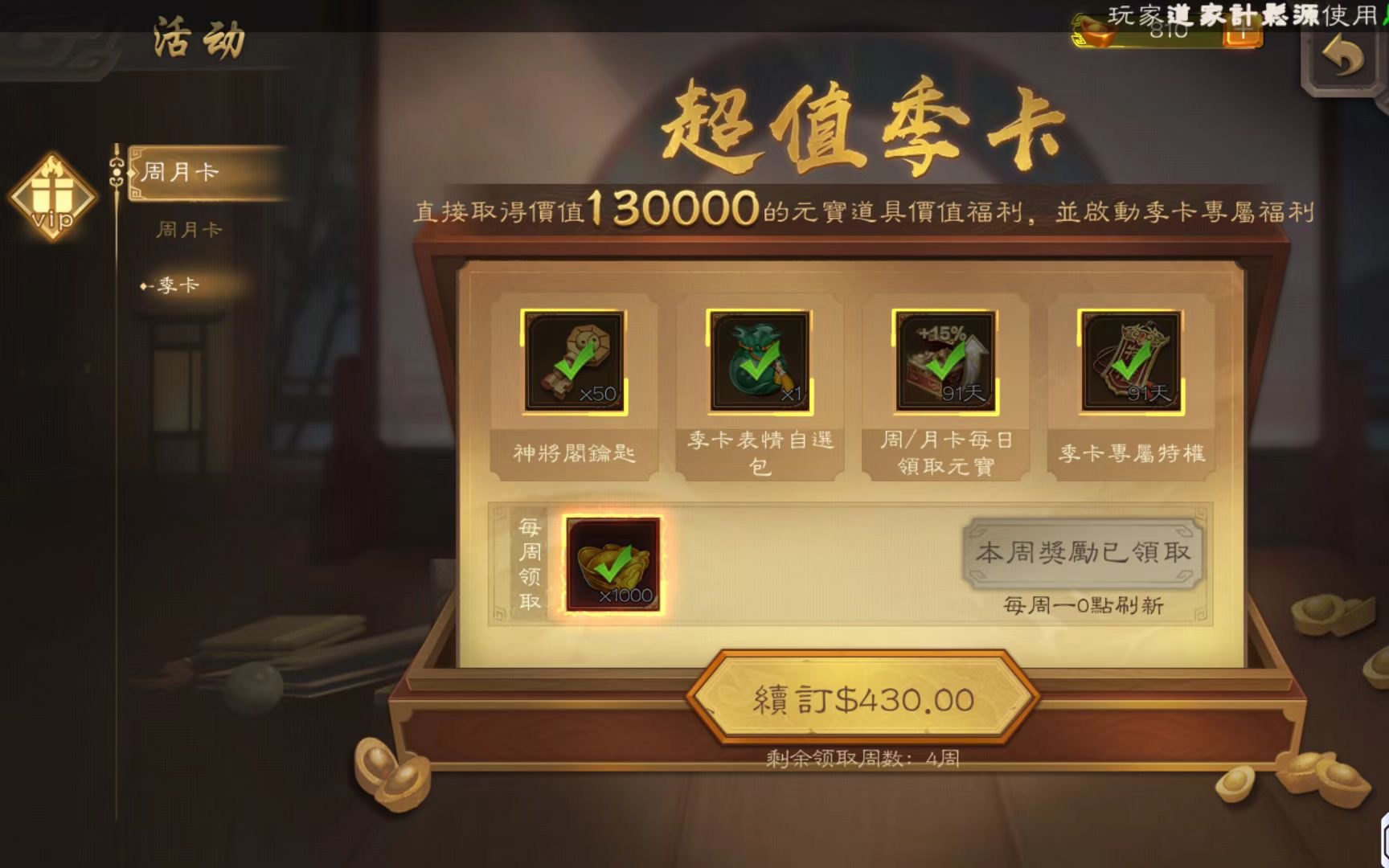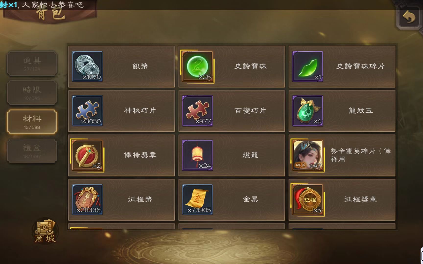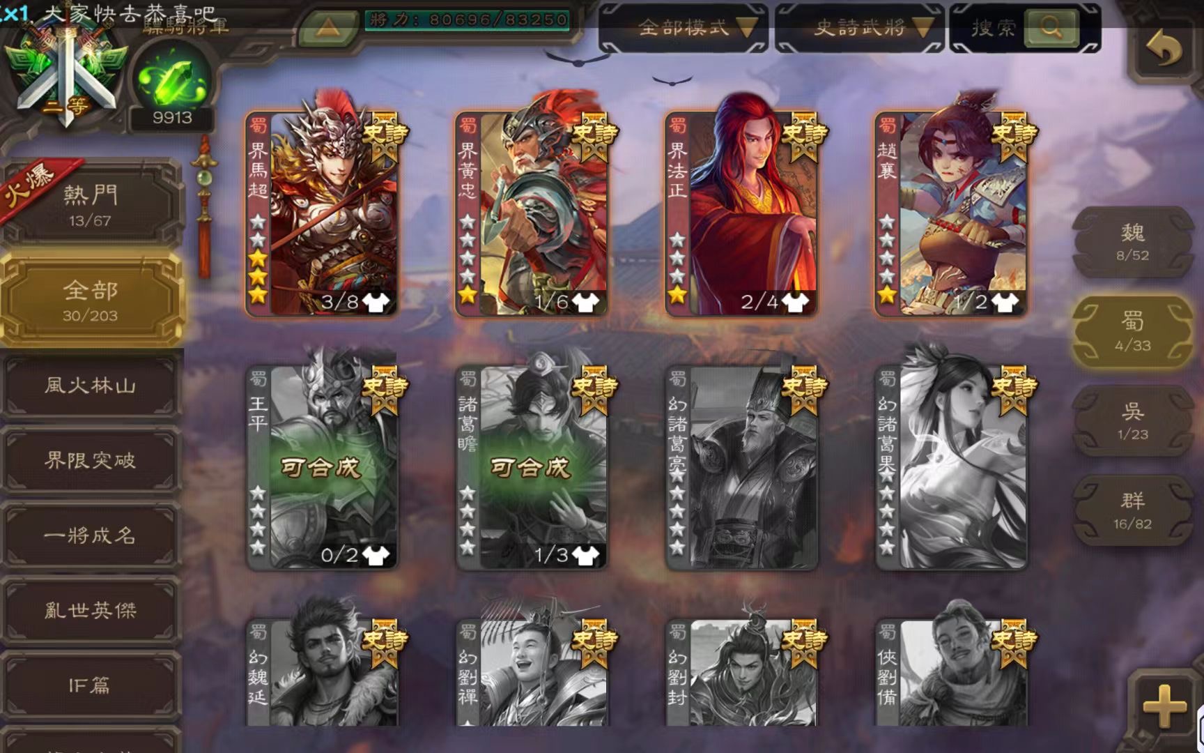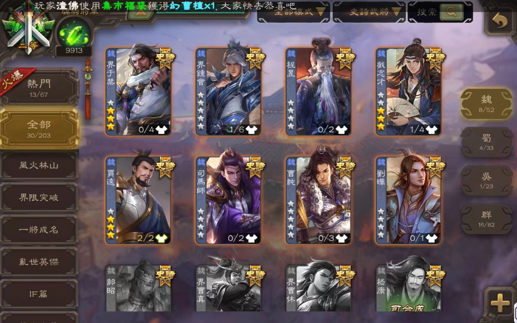 開了至尊奉祿 勢辛憲英47片 結束前可以搞出來 精品謀諸葛瑾 武安國 該有的基本都有 將魂9990 金票70000 如圖所示
