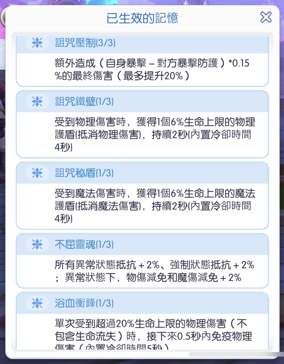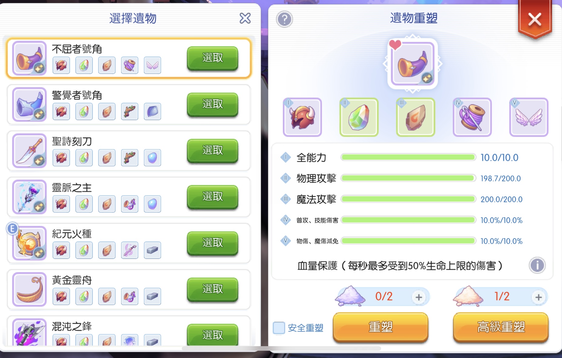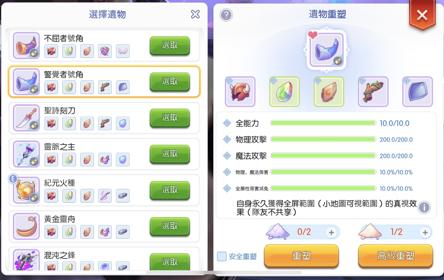 遺物:真視 血保 防轉 火種 靈脈 (異常、命中皆點亮,都75%左右快點滿)