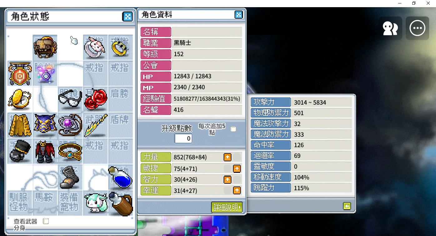 帳號 【152等、龍騎士_黑騎士】 120攻幻龍、11攻手套、15力披風、50屬上下衣、銀豬 另備有高命中裝